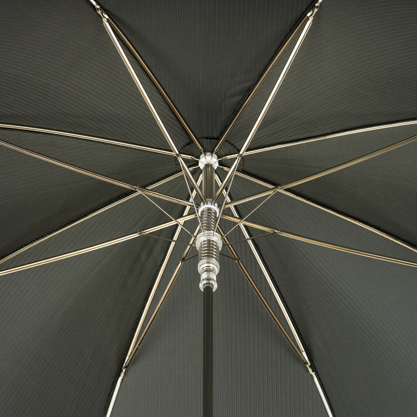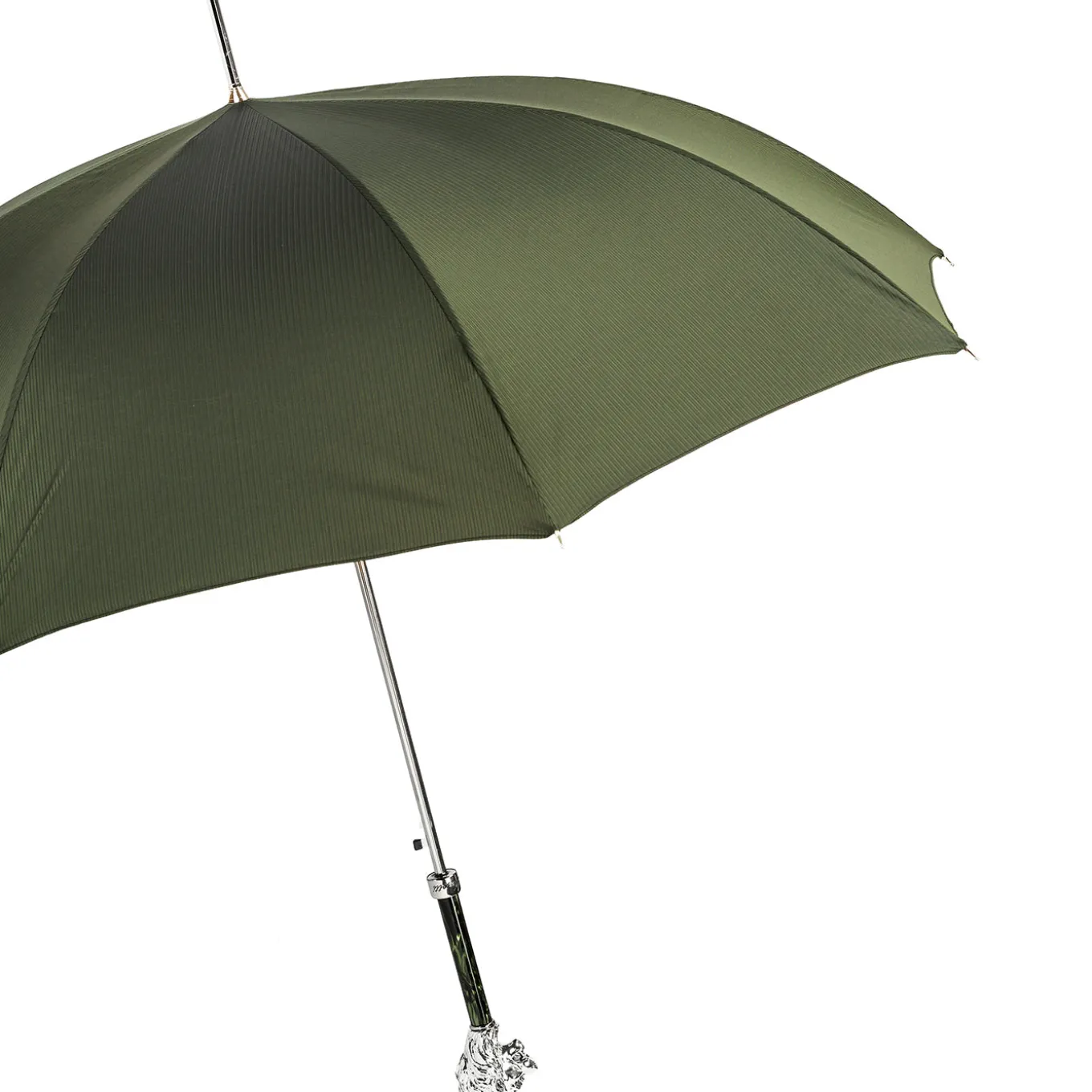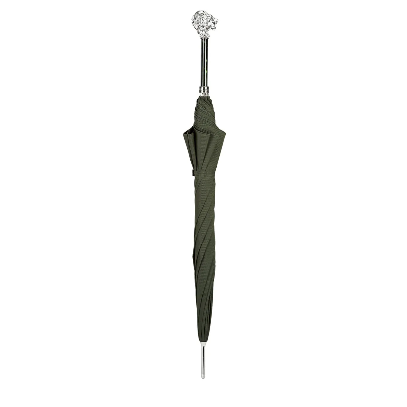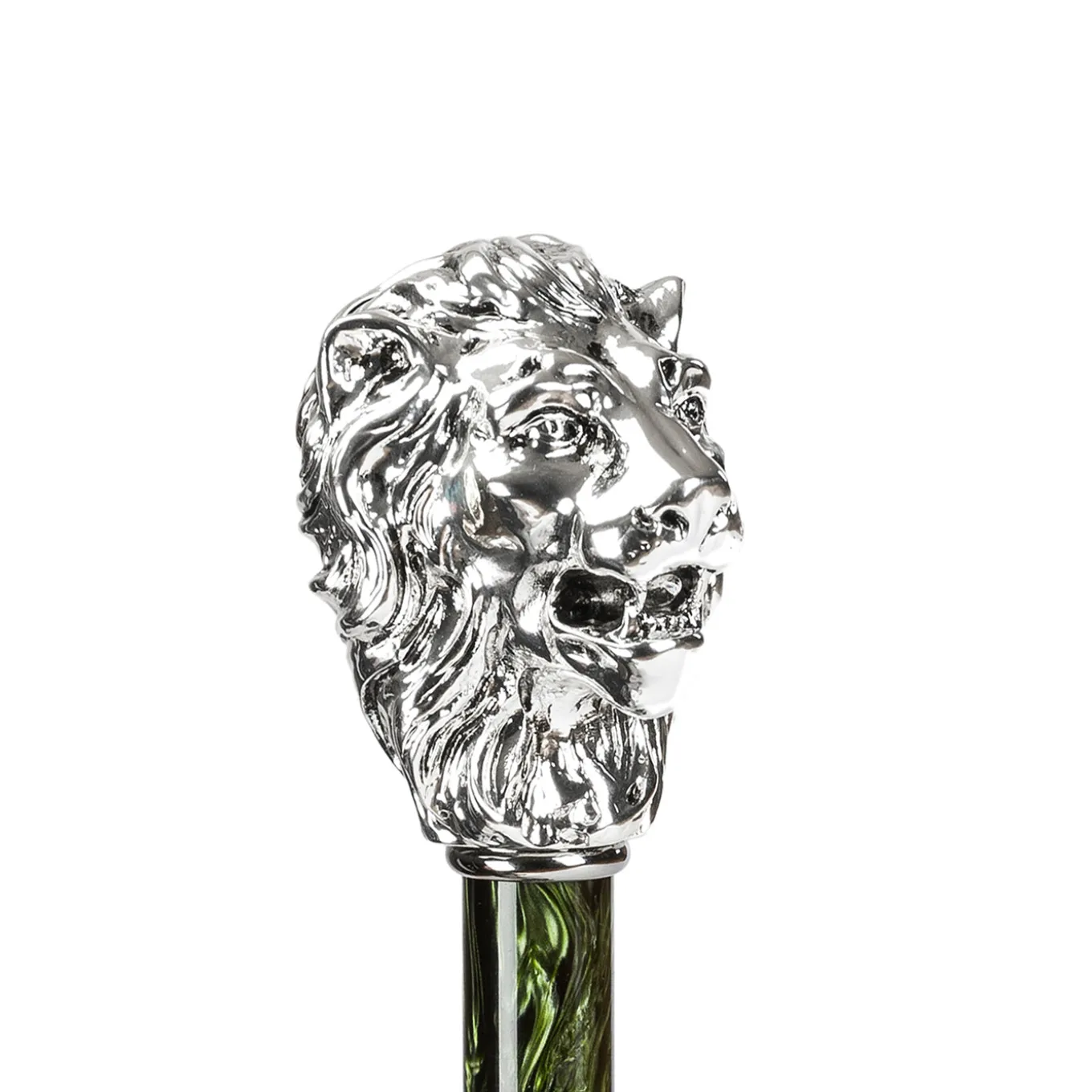 An automatic umbrella featuring a sophisticated silver-plated resin handle intricately designed in the shape of a lion’s head. The canopy is crafted from durable green fabric 100% Polyester, combining functionality with a distinguished aesthetic suitable for everyday use. It balances classic elegance and practical design.