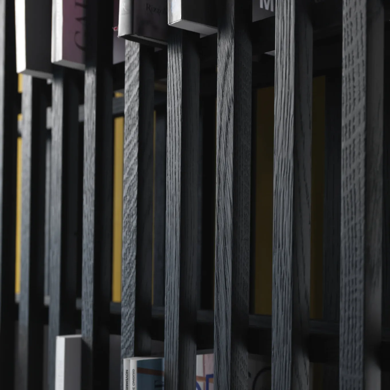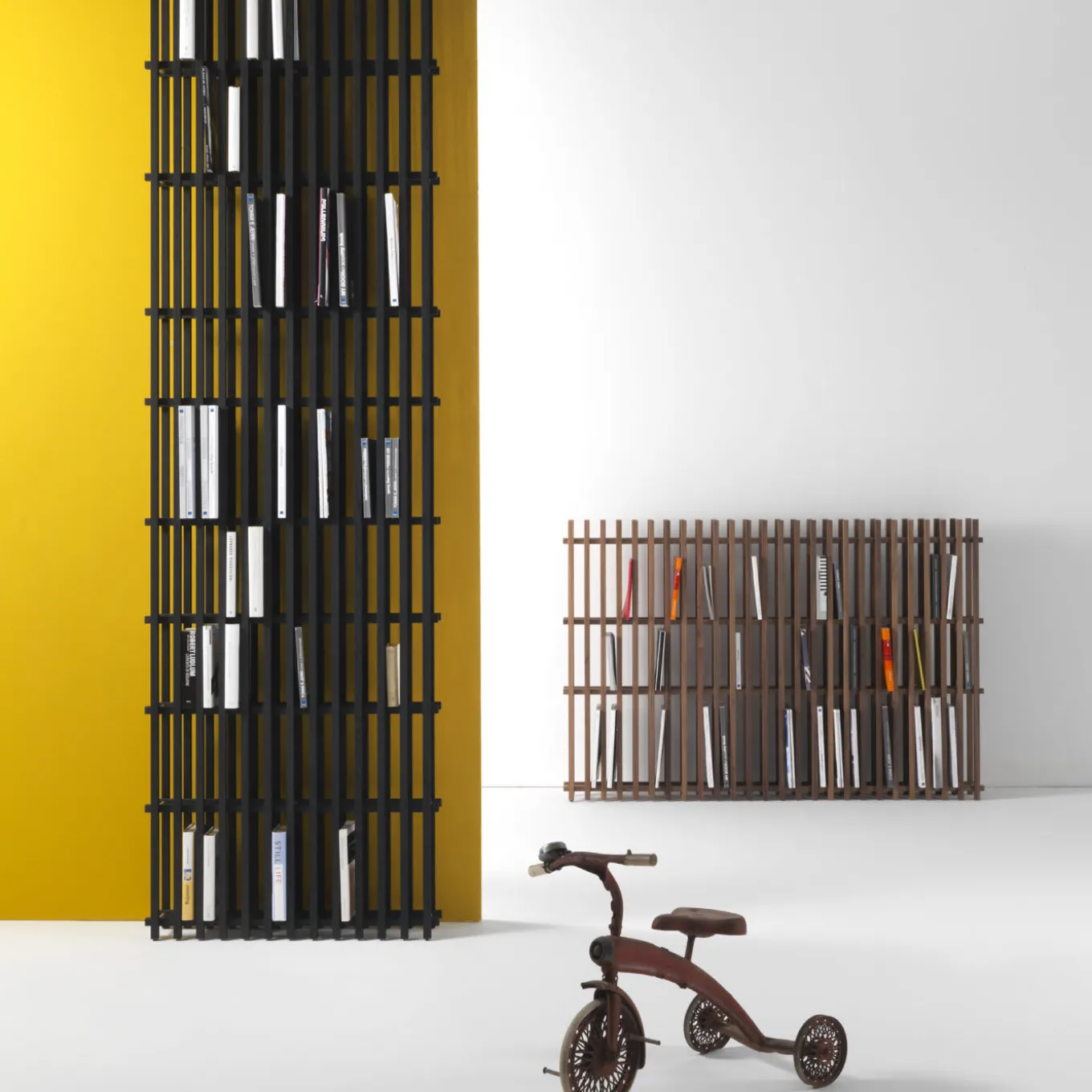 This versatile bookshelf is made entirely of durmast and its light and elegant structure can be used as a traditional bookshelf placed by a wall, or as a wall divider in the middle of a room. Its light frame makes it a striking piece that is more than just a storage place for books and objects. The durmast is painted black, but it is possible also to have it in natural durmast or in canaletto walnut. This exquisite piece of functional decor will be a perfect addition to a contemporary decor and its height can be customized to fit any space. Please, ask the concierge for changes in price with customization.