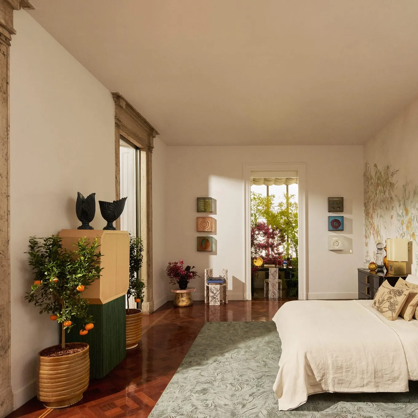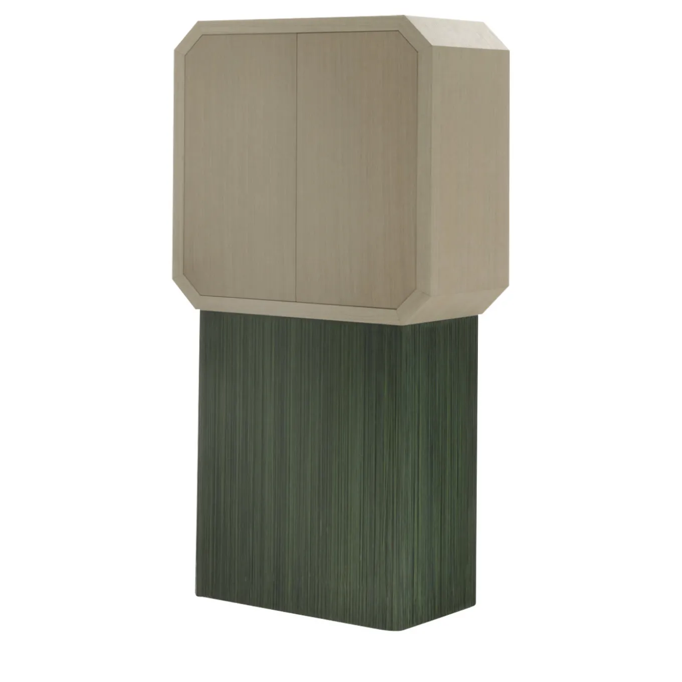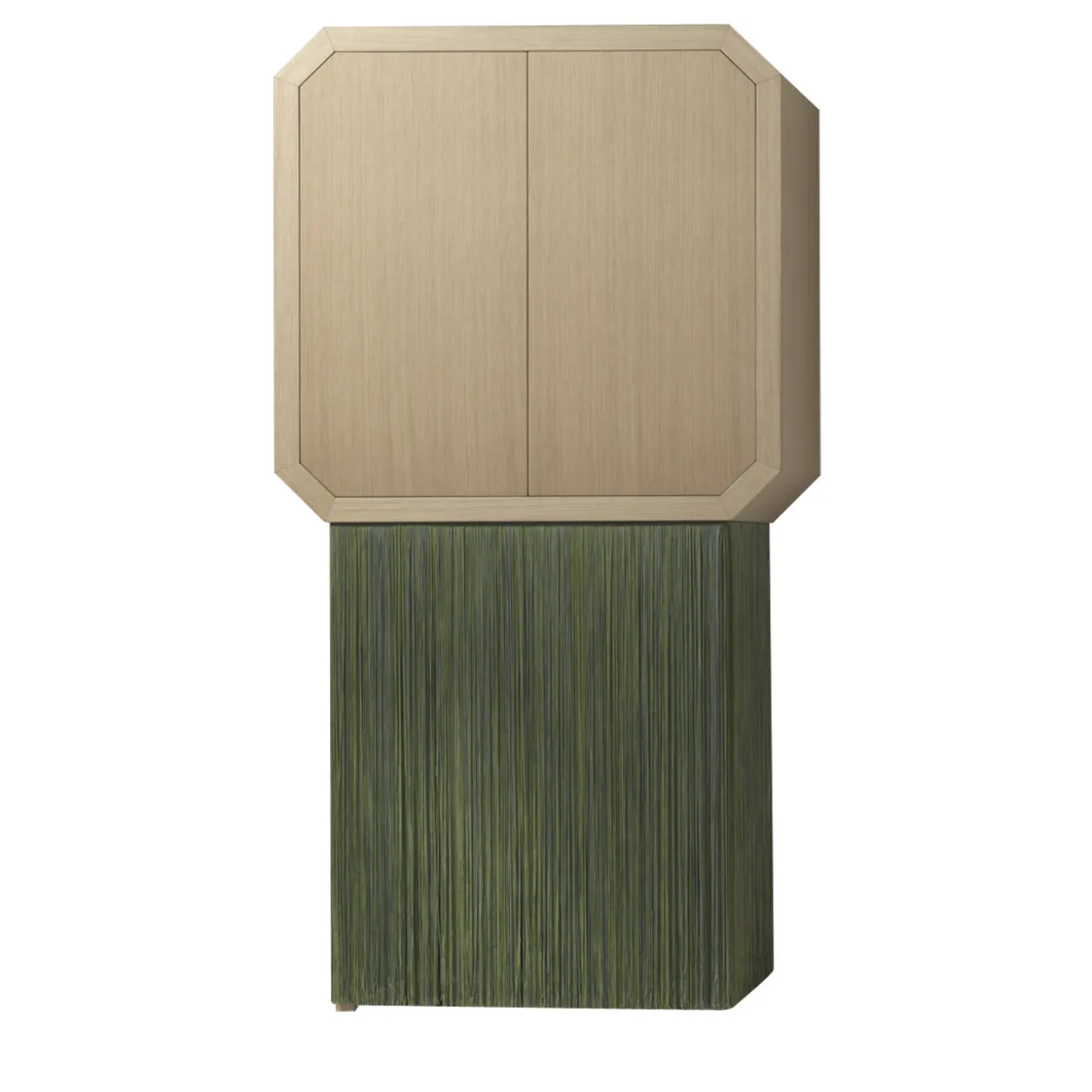 Inspired by the atmosphere of the theater, this unique cabinet is part of the Sipario series. The top cabinet is available in oak or “Canaletto” walnut wood with an interior glass shelf. The storage space below is covered with two long fringes of traditional Italian trimming available in different colors, made with the “Tripolino” technique, a very thick trimming obtained with one single thread carefully crocheted.