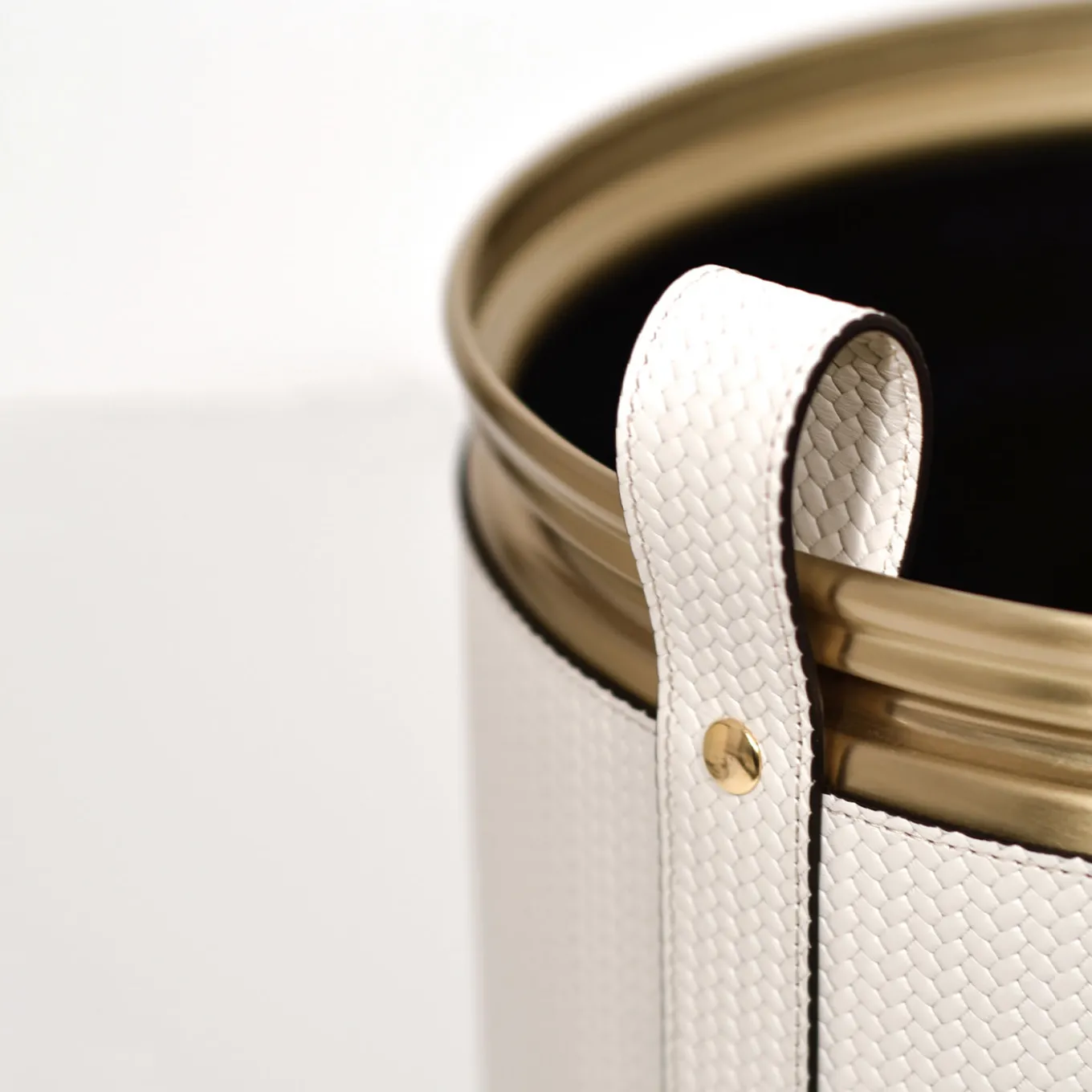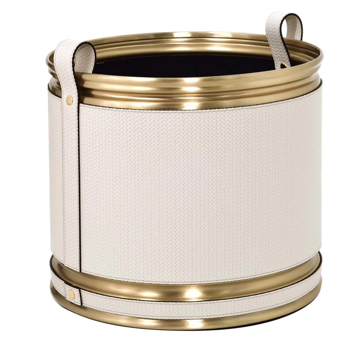 This small, wheeled, ornamental flower-pot holder is available in choice of finishes: satin brass, chrome or burnished. The use of a leather covering for a garden product is visually surprising, unique and sophisticated. It is customizable in all the leathers and colors featured in the catalog. A larger version is also available.