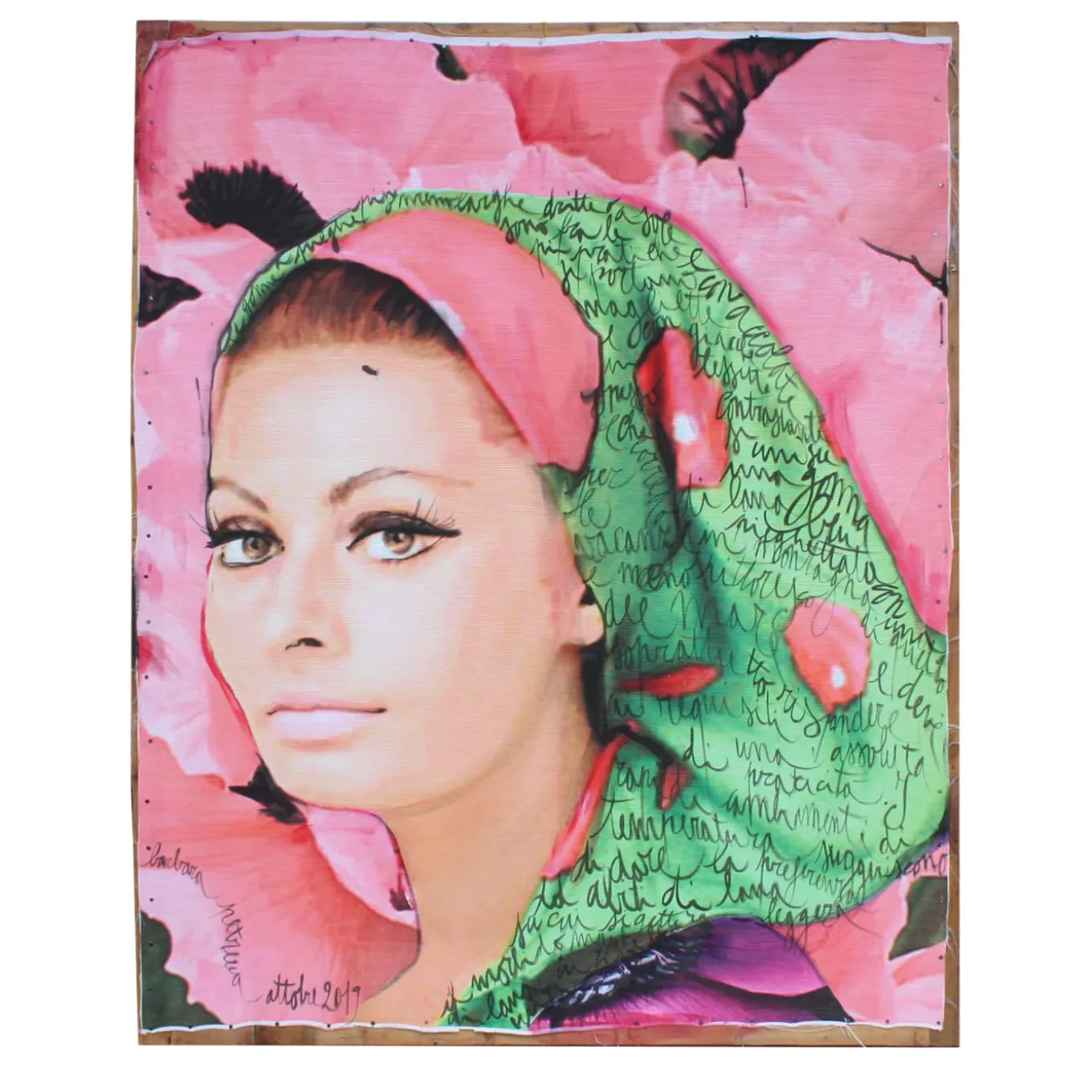 Infusing any style decor with a dreamlike ambiance, this magnificent tapestry depicts the marvelous, iconic visage of Italian actress Sophia Loren. Printed on fabric, small details are then painted by hand by Barbara Petrecca with acrylic paints. This unique, distinctive piece is fixed on a rough wooden frame, adding to its vintage character. Any variation or imperfection is due to its exceptional craftsmanship.