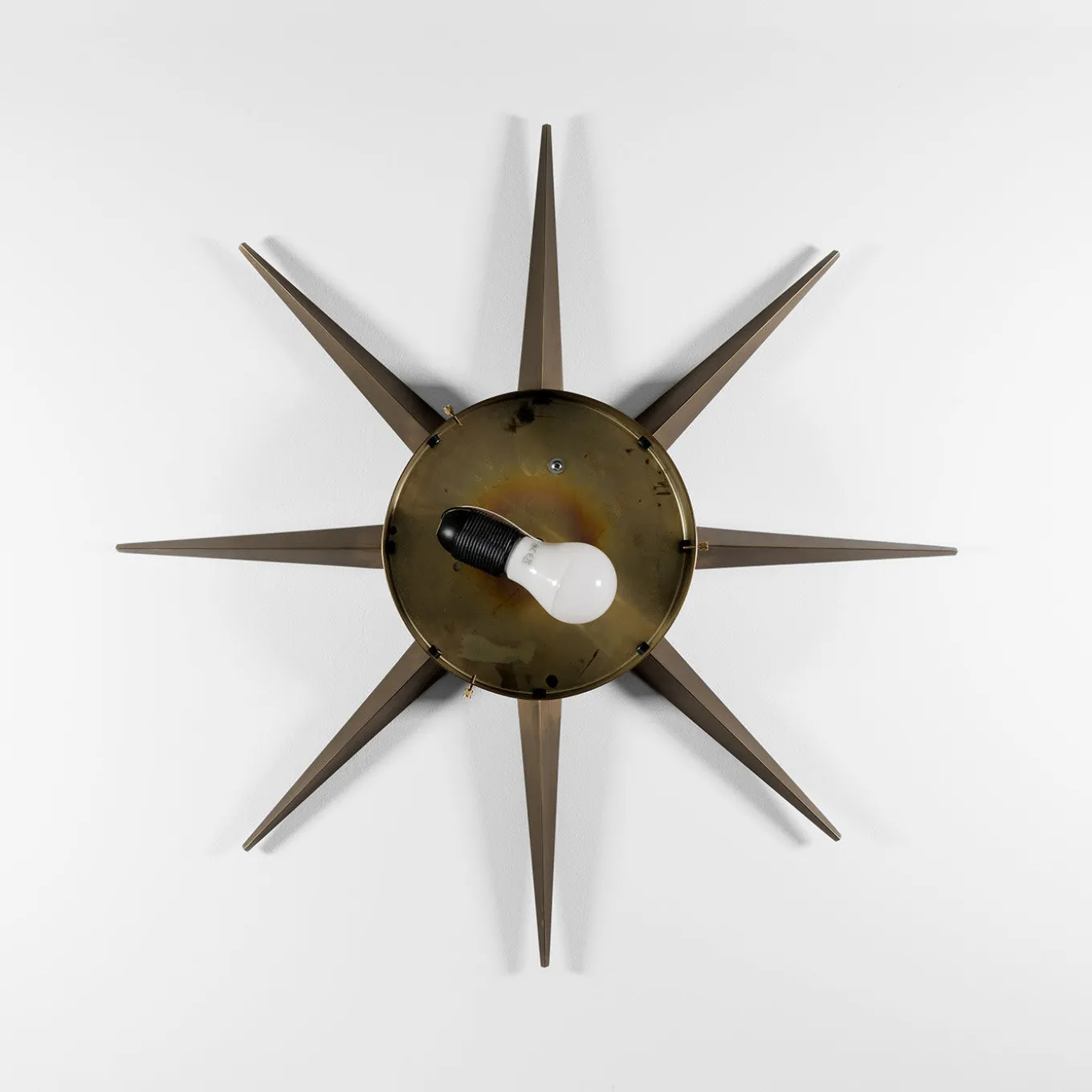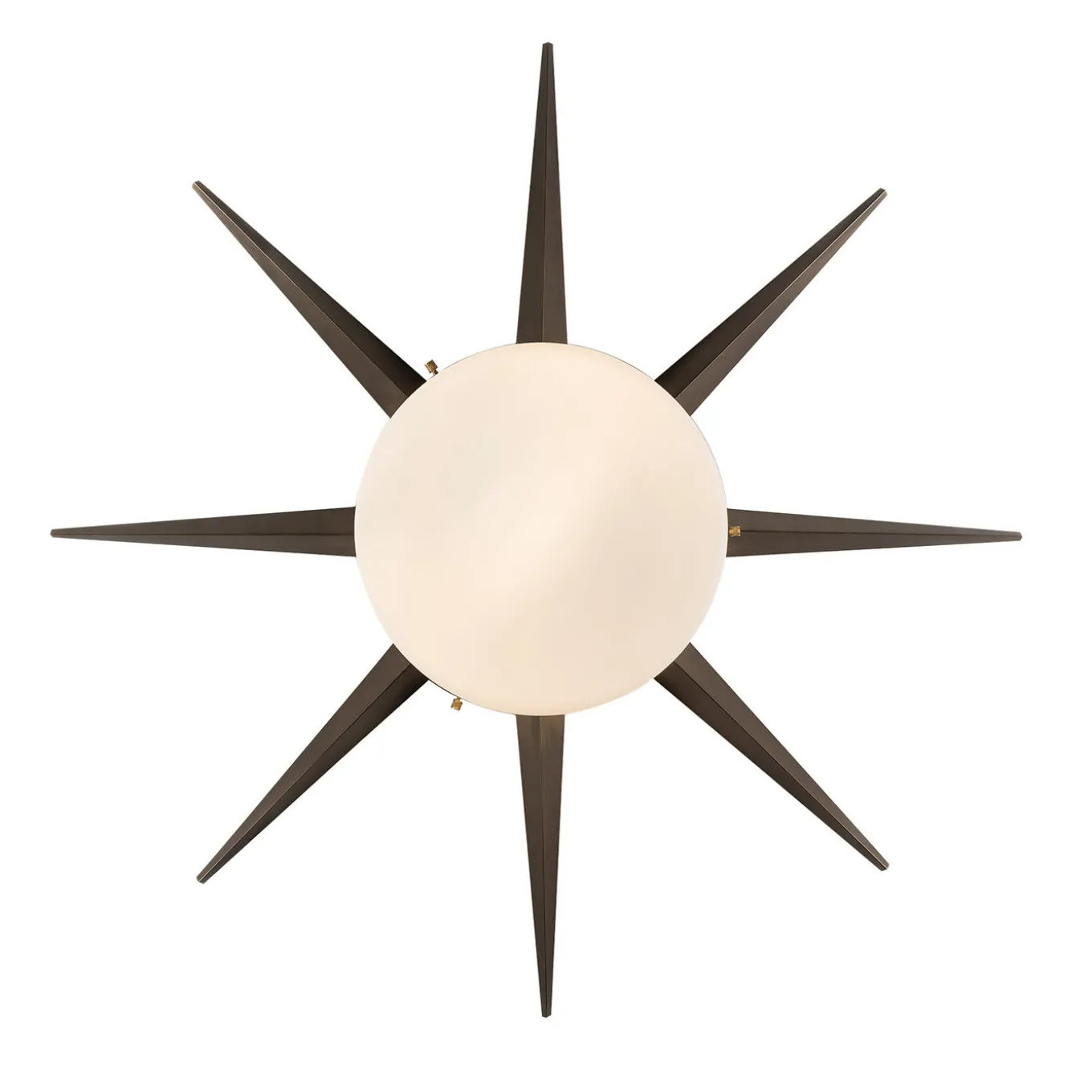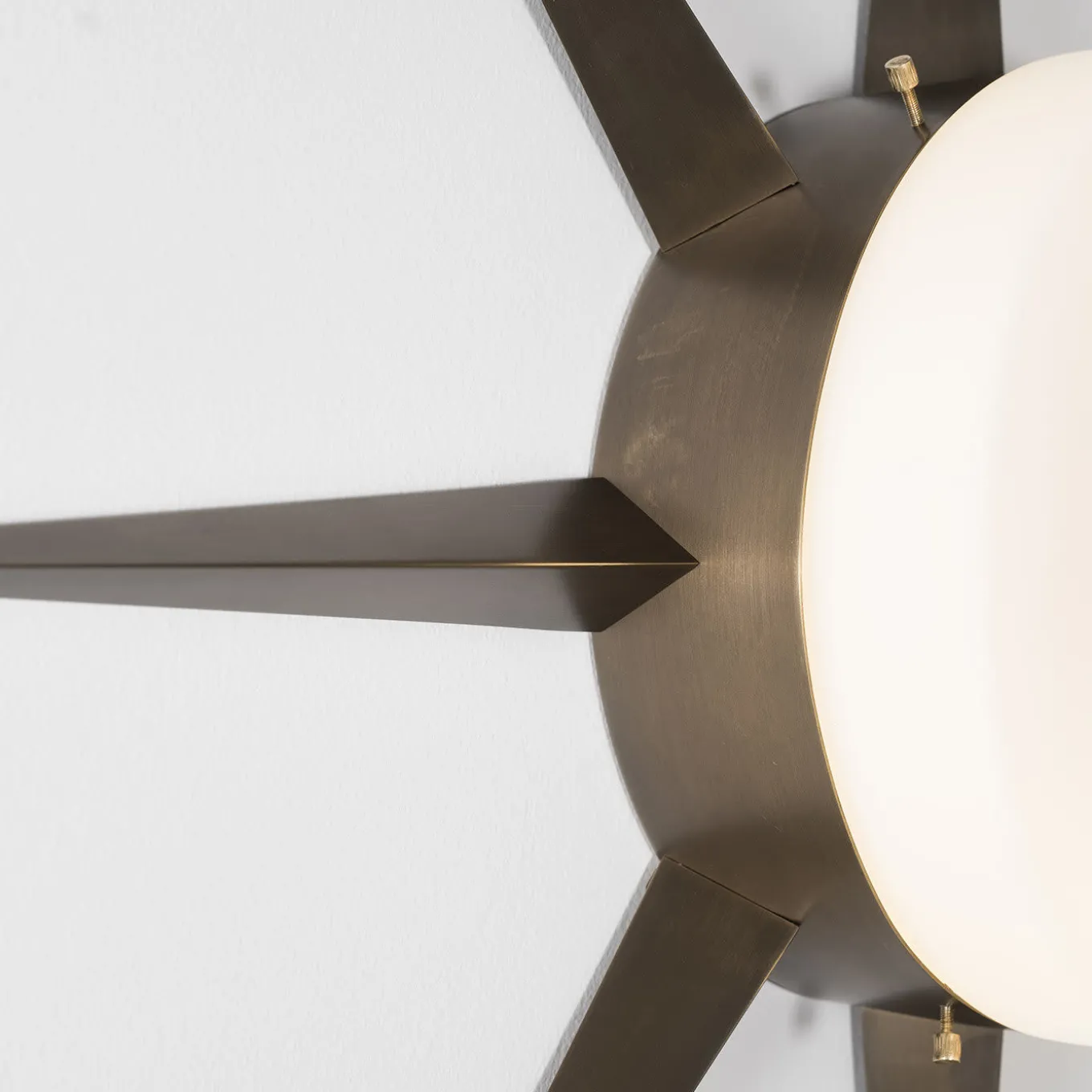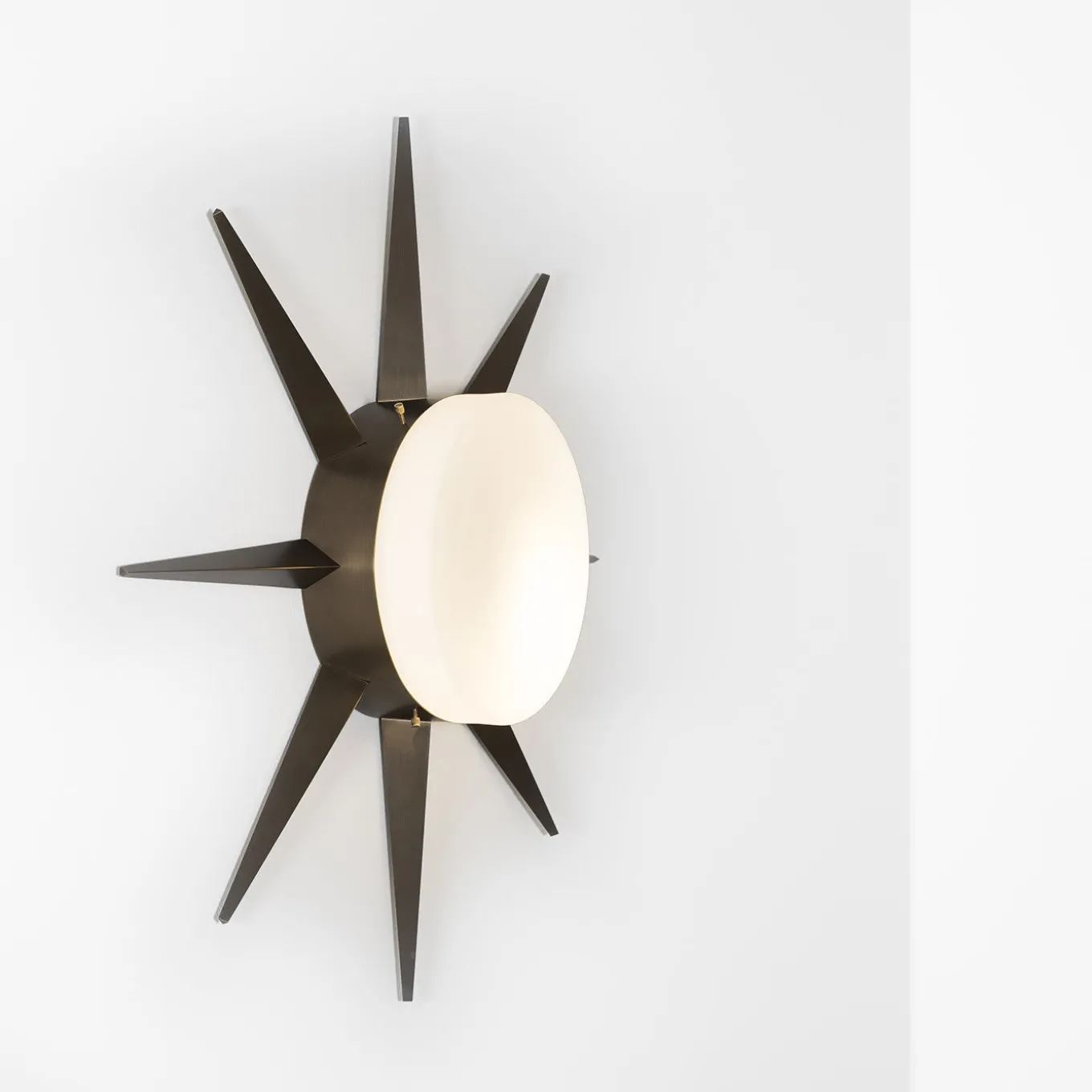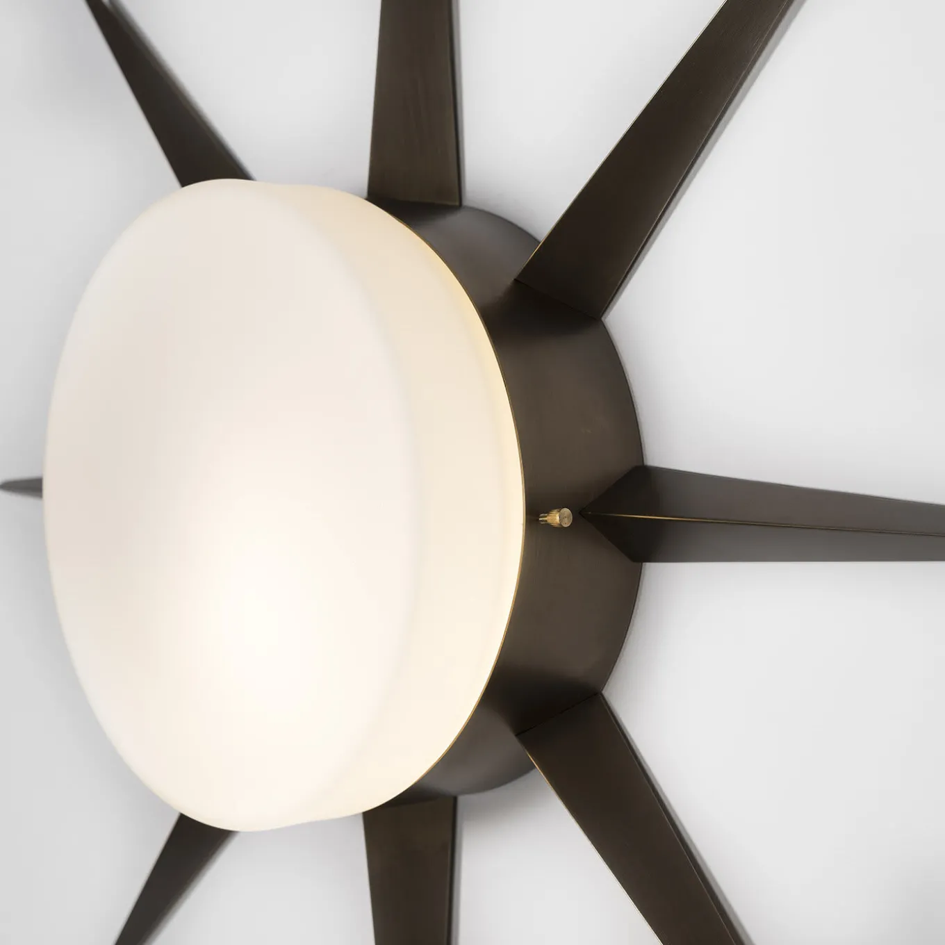 A striking accent piece for a modern decor, this lamp will adorn any wall or ceiling with subtle sophistication. Fashioned of chrome-finished brass, the eight, pointed arms surrounding the central luminous shade in opaline recall sun rays. Available in other finishes, it supports incandescent and LED bulbs (not included) and can be wired for North America (110V 60 Hz – E26 socket bulbs) or Europe (220V 50Hz – E27 socket bulbs).