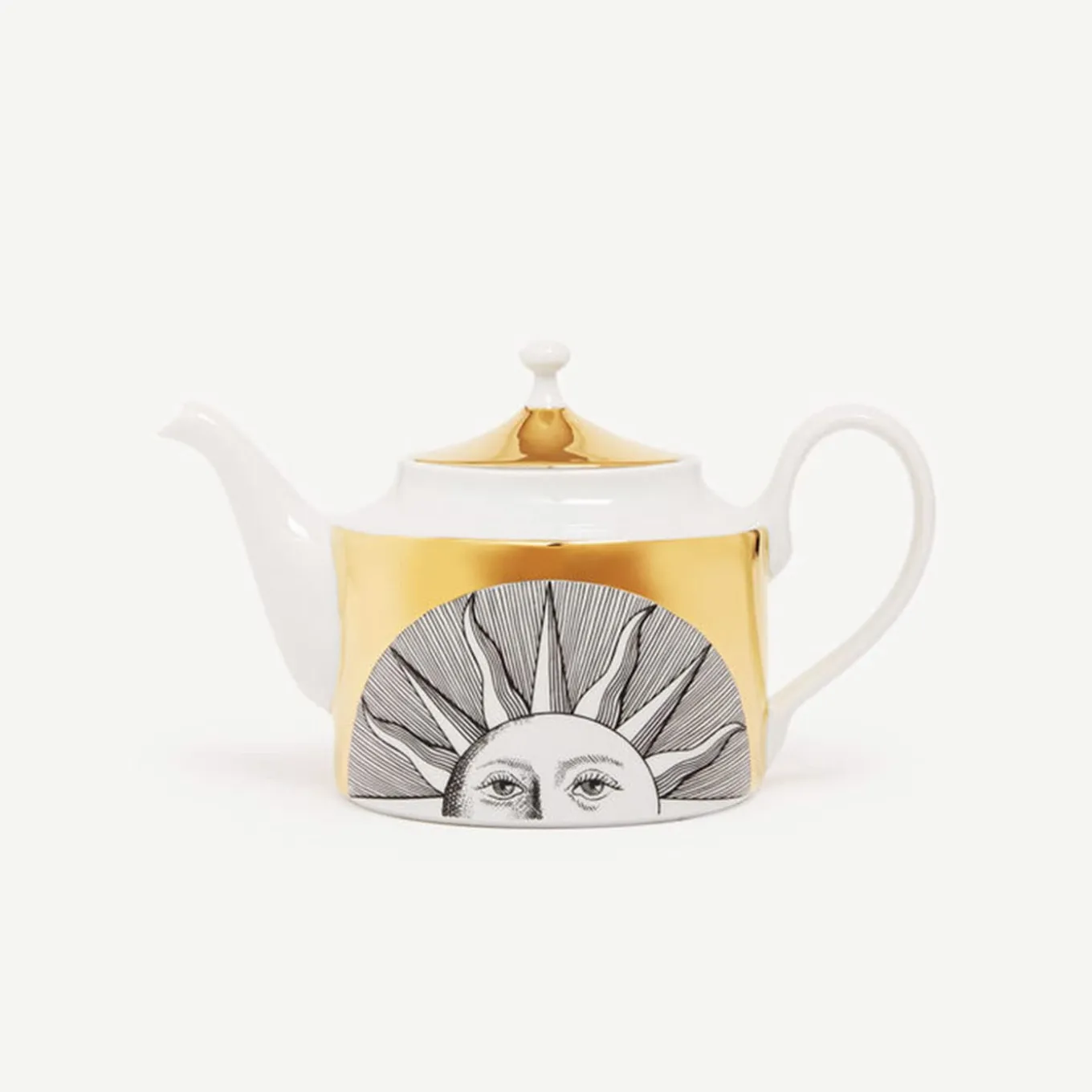 The motif of the sun covers this hand-decorated porcelain teapot with gold accents, transferring Fornasetti’s imagery to an object for daily use and thereby transforming it into a collector’s item. Any minor discrepancies between similar creations are the result of craftsmanship and attest to the uniqueness of each product.