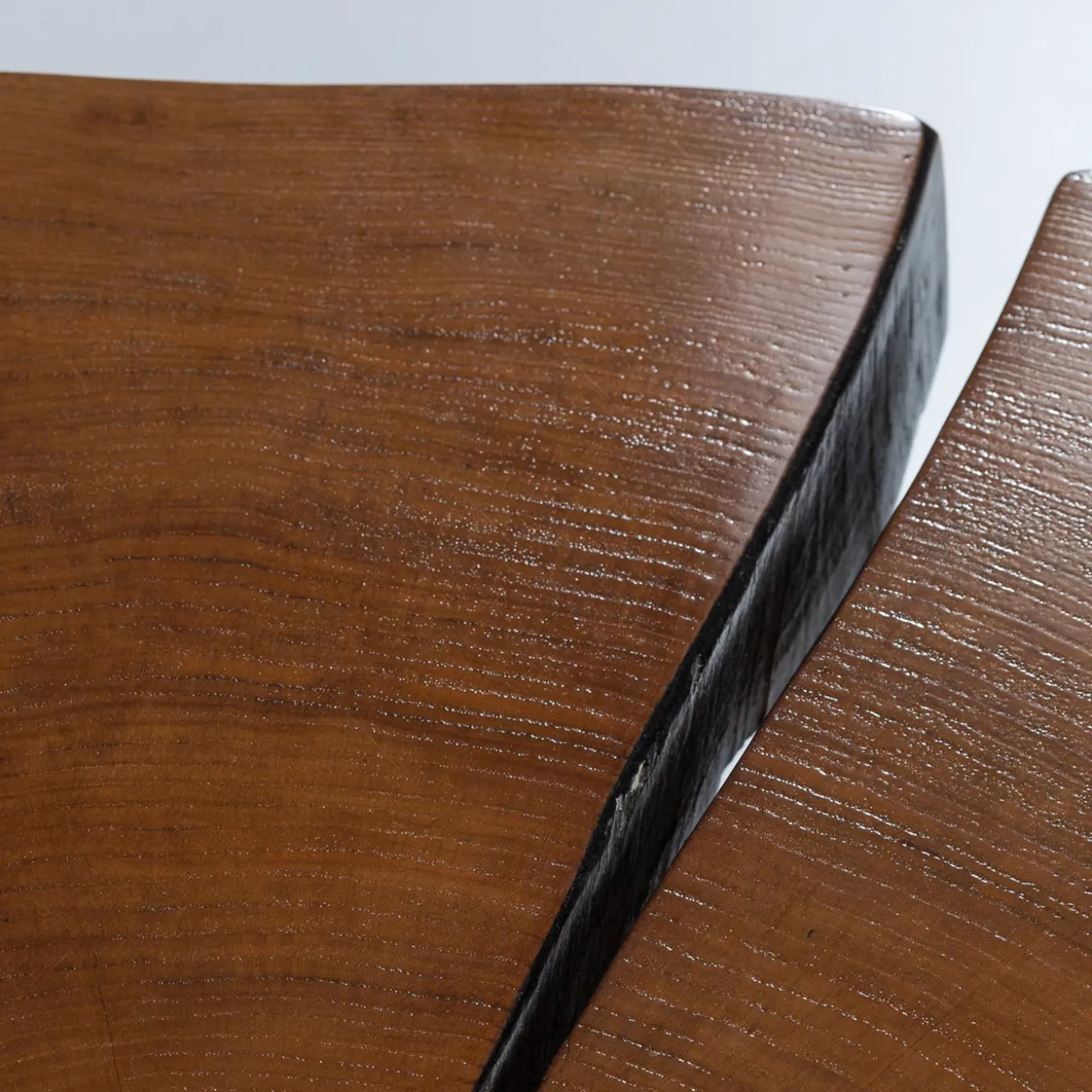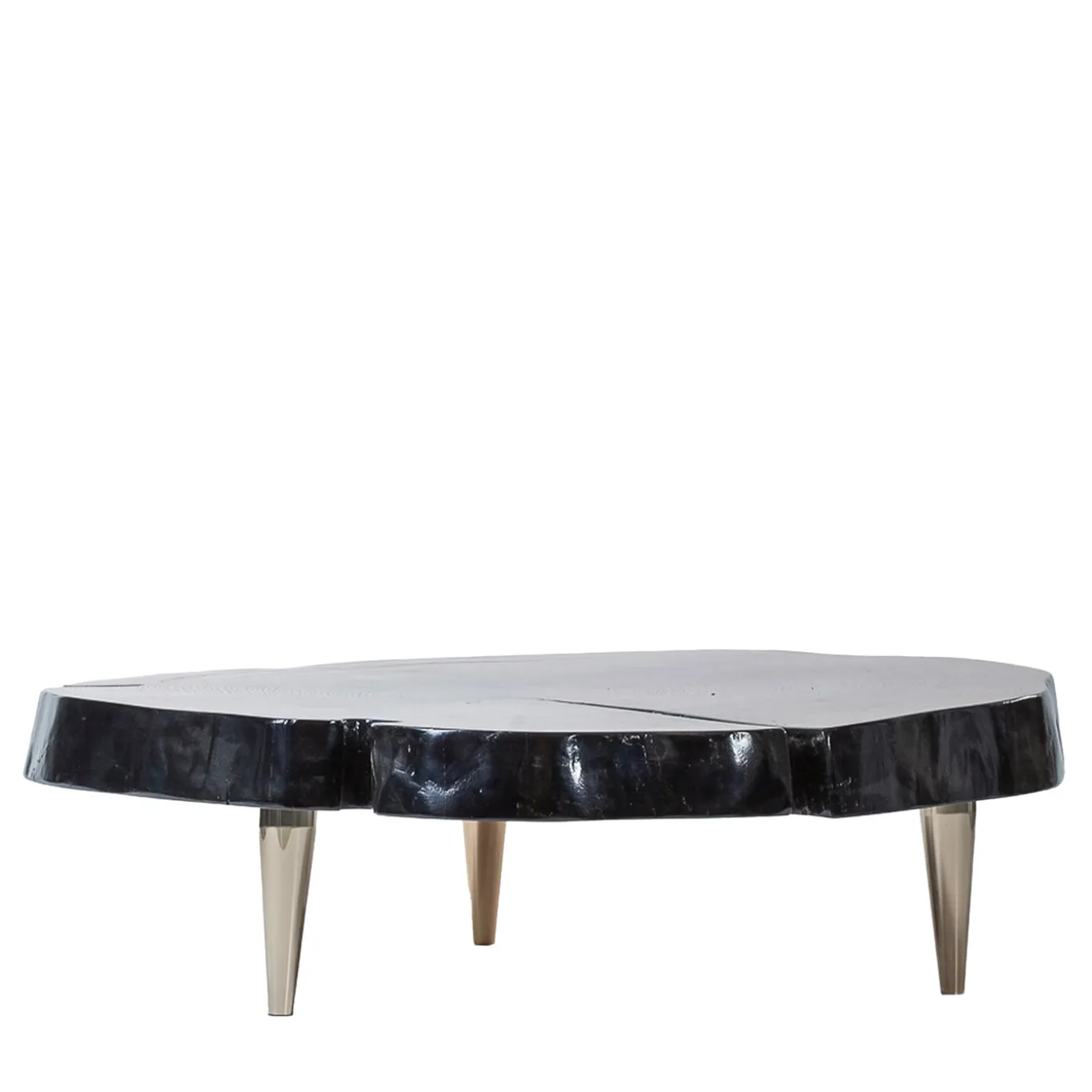 Raised on tapered, polished brass legs, this eye-catching coffee table will bring into modern homes the unique beauty of shapes drawn by nature. The thick tabletop was carefully handmade from a century-old chestnut stump, its unreplicable grain revealed by the transparent finishing accenting the top surface. Completed by a black finish along the sides, it is a one-of-a-kind piece.