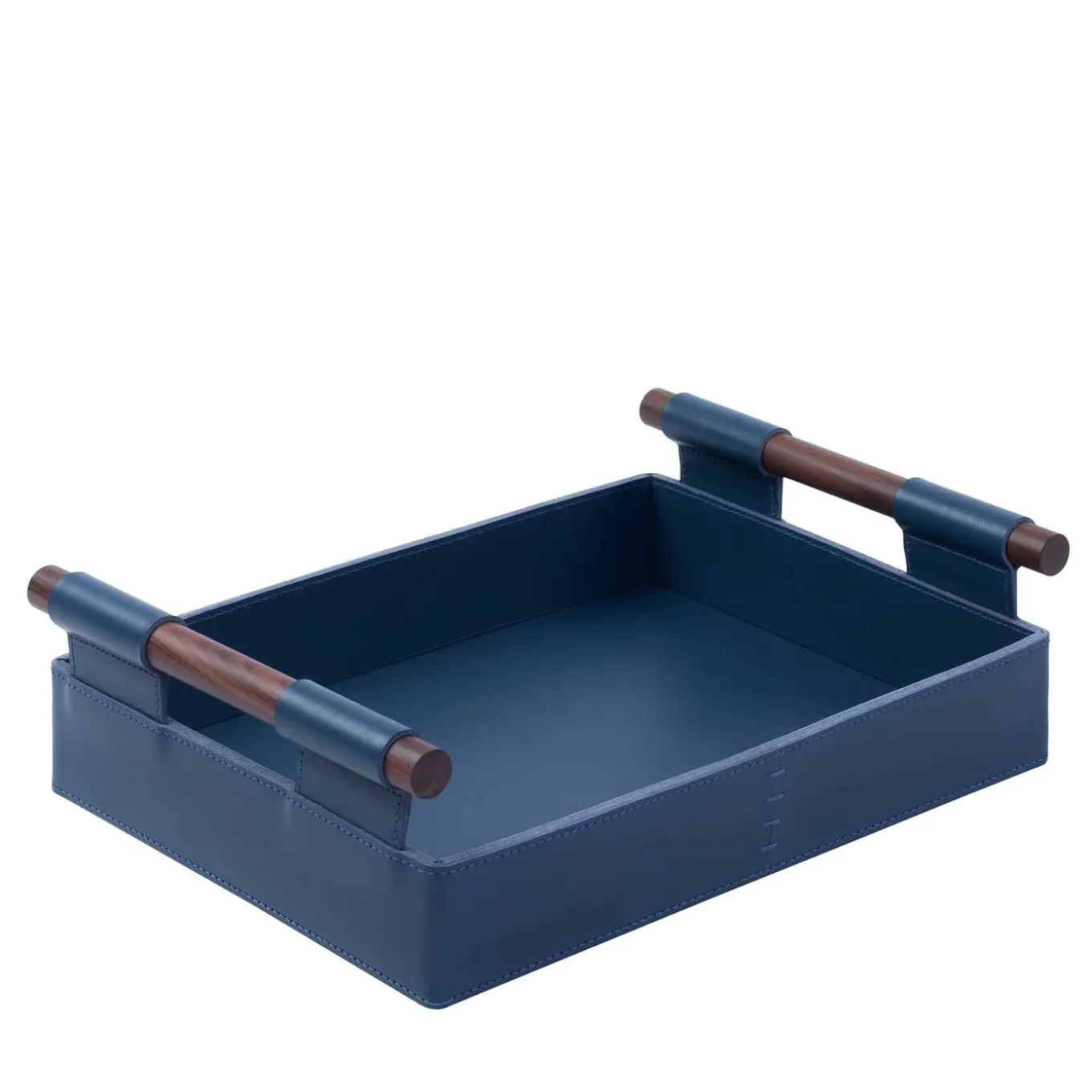 This stunning tray is part of the Sorrento Collection, a series of versatile and striking open boxes that will help gather small objects or display collectibles in a modern entryway, bathroom, or bedroom. The minimalist silhouette is crafted of saddle leather dyed navy blue with the use of vegetable pigments. The tall edges and addition of solid rosewood cylindrical handles creates a unique shape that will also hold various content.