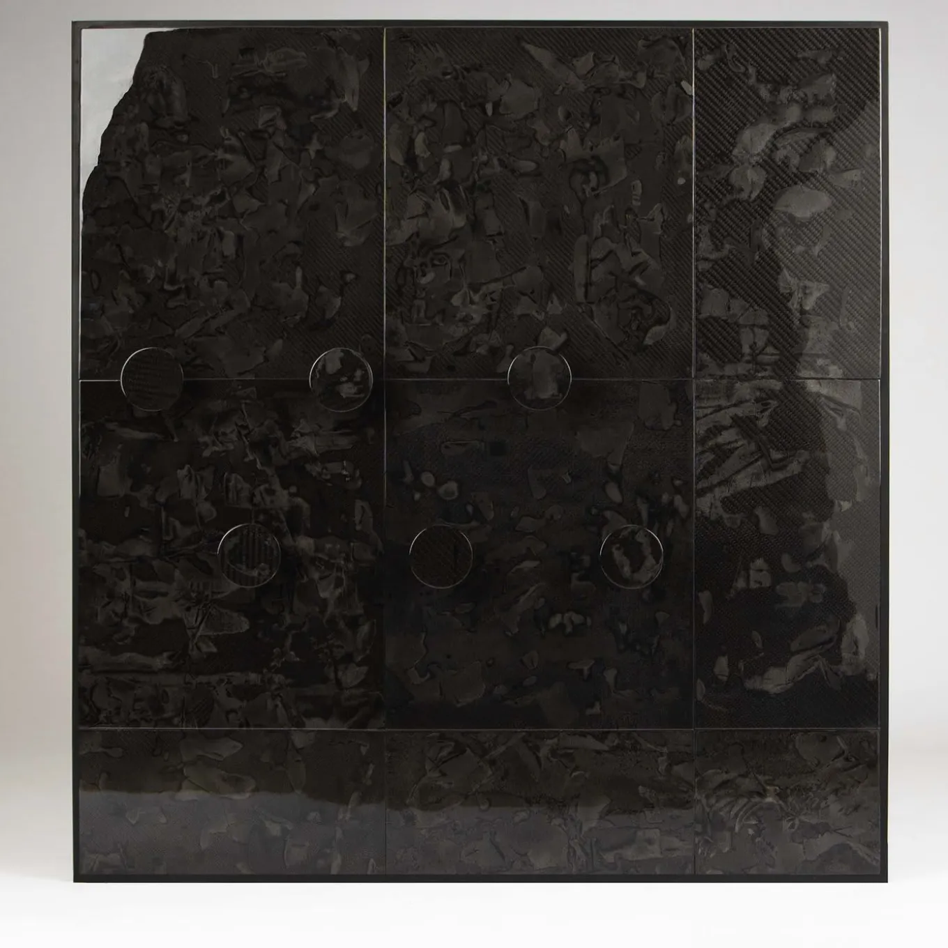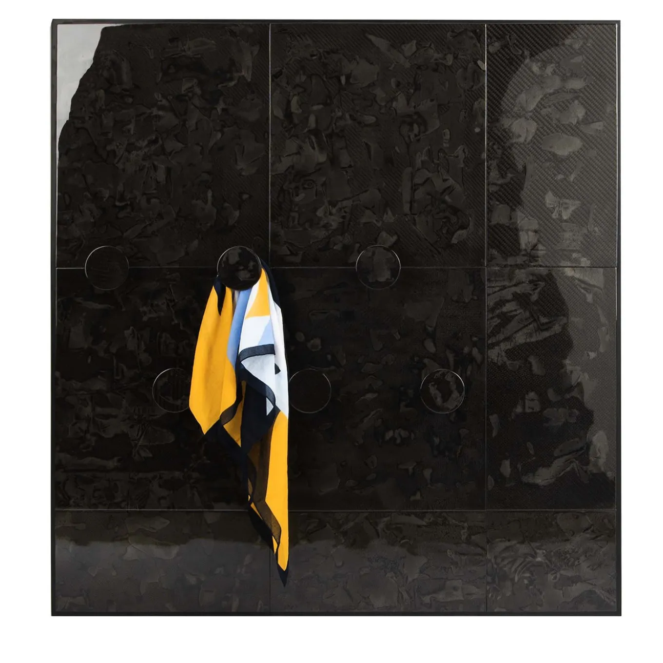 Part of the Sorry Jannis collection, inspired by the work of Arte Povera artist Jannis Kounellis, this coat rack is a stunning piece of functional decor that will enrich the wall in a contemporary entryway with its utterly unique aesthetic and one-of-a-kind material. Each panel is crafted of Frisoli Cloto, exclusively developed by Frisoli and made of carbon fiber on which is poured aerospace material to create a superb interplay of dark grey and black hues. Each piece is different from the other and will be an exquisite post-modern decorative accent.