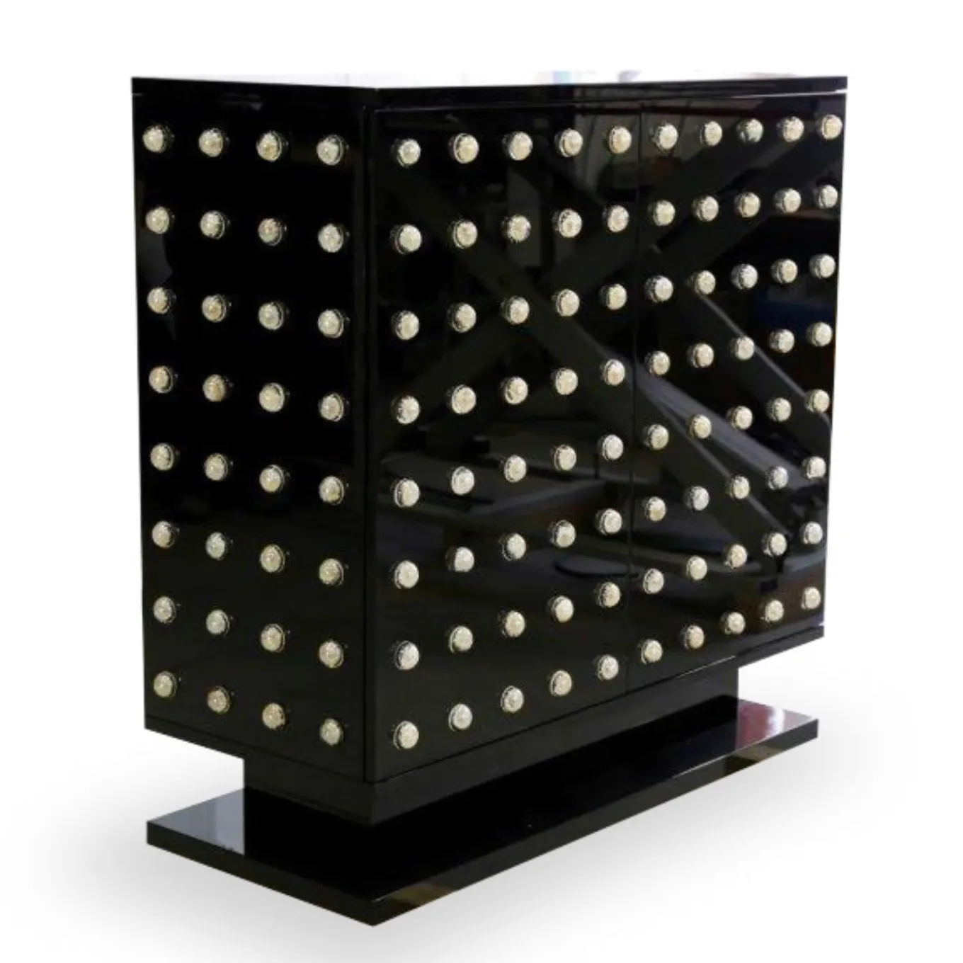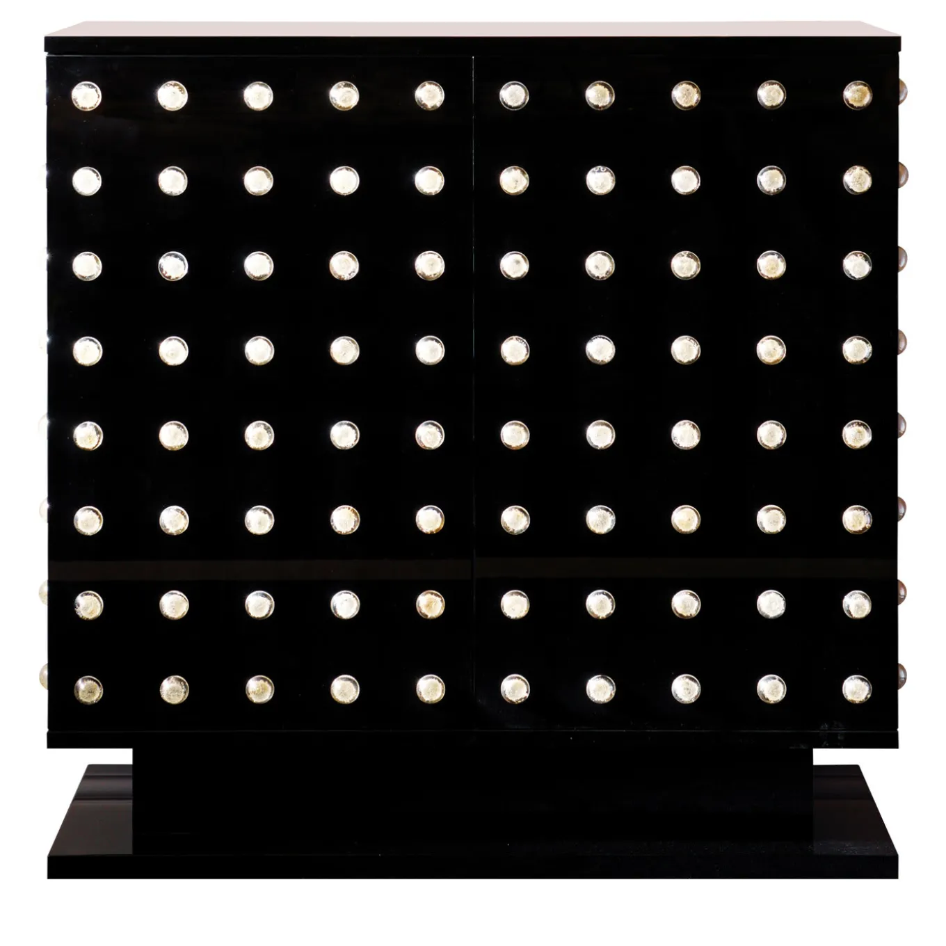 The stunning look of this superb wooden cabinet is obtained by adding to the two black lacquered front doors 144 half-spherical glass elements. Adding to the rigorous decoration an ethereal quality, this striking object of functional decor will be the focal point of a living room or dining room, while also providing precious and versatile storage space, with its interior divided by two shelves also in gloss lacquered finish. The elegant plinth base completes this unique design.