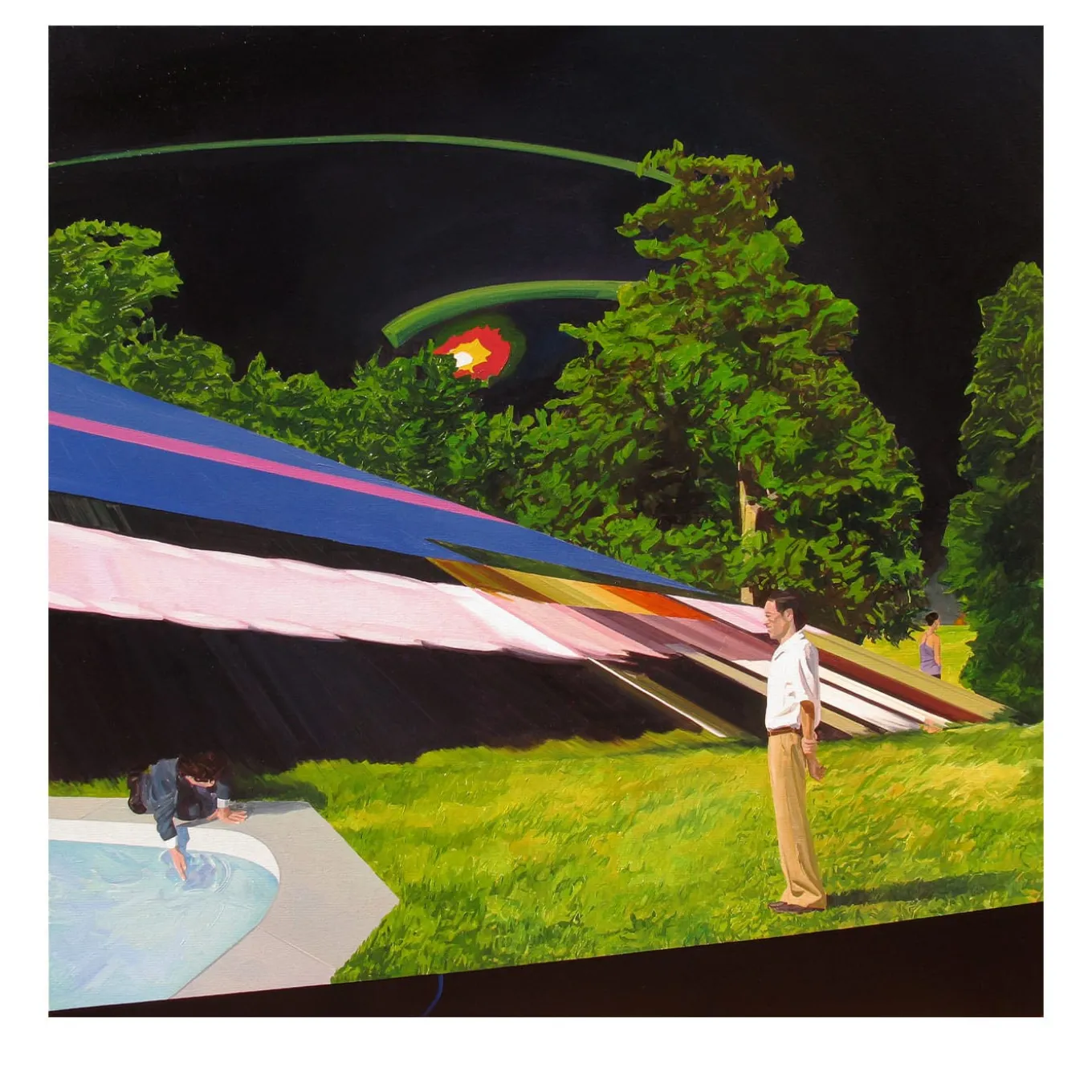 Rich in surrealist influences, this singular oil painting – named “Spirali di luce e tenda elettromagnetica avvolgono mezzo campo con piscina” – belongs to a series distinguished by whimsical elements that burst into the scene. The people dotting the scene around the pool seem to be waiting for the surrealist-inspired awning to re-wrap and leave everything in an unaltered state.