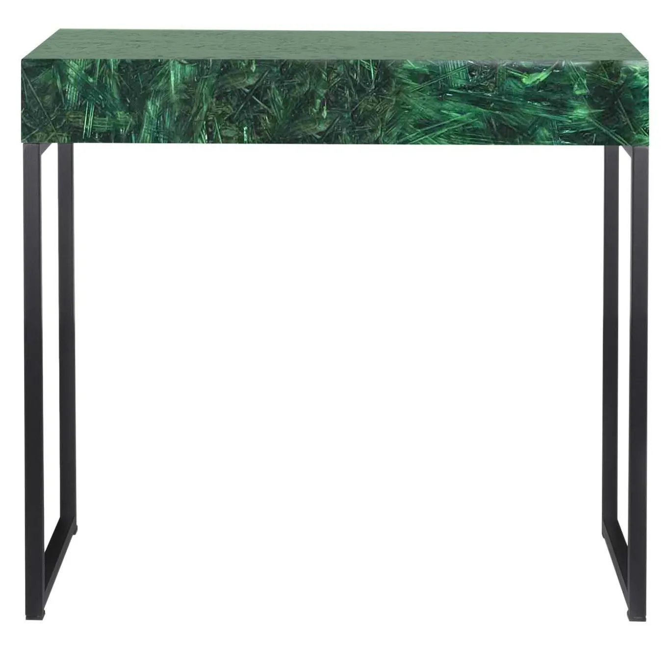 Add a modern touch to your home with this one-of-a-kind green console table. The black lacquered metal 25×25 mm section structure consists in two rectangular hollow metal legs, which add a touch of contemporary geometric style. The 12 cm high top and the drawer are made in polished OSB and metal base.