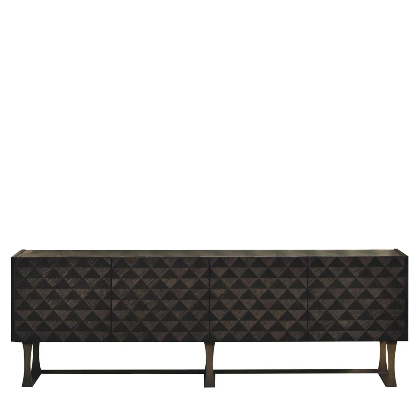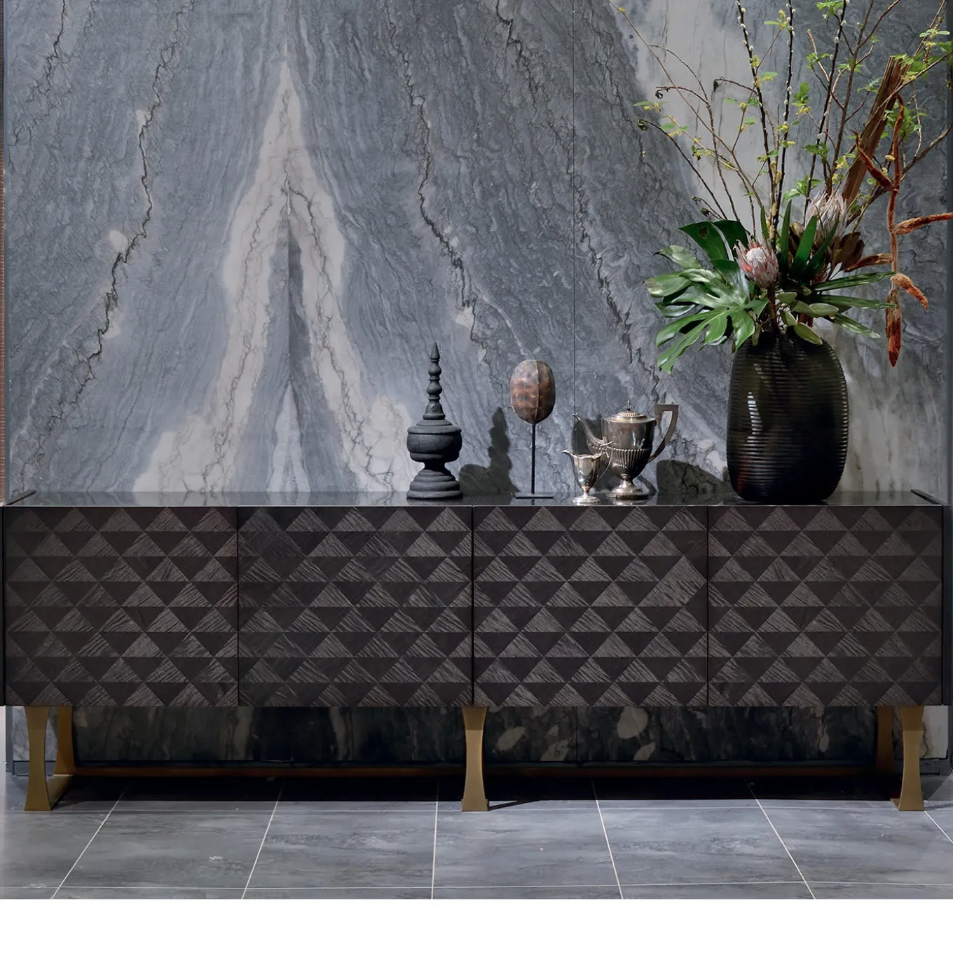 Featuring a geometric inlay design, the Square Sycamore Sideboard is completed with a dark frisé finish. Topped with Marquinho marble for an extra luxe finish, the piece stands on metal feet with a satin bronze finish. Perfect for contemporary dining areas, the sideboard offers ample space for dish and glass storage.