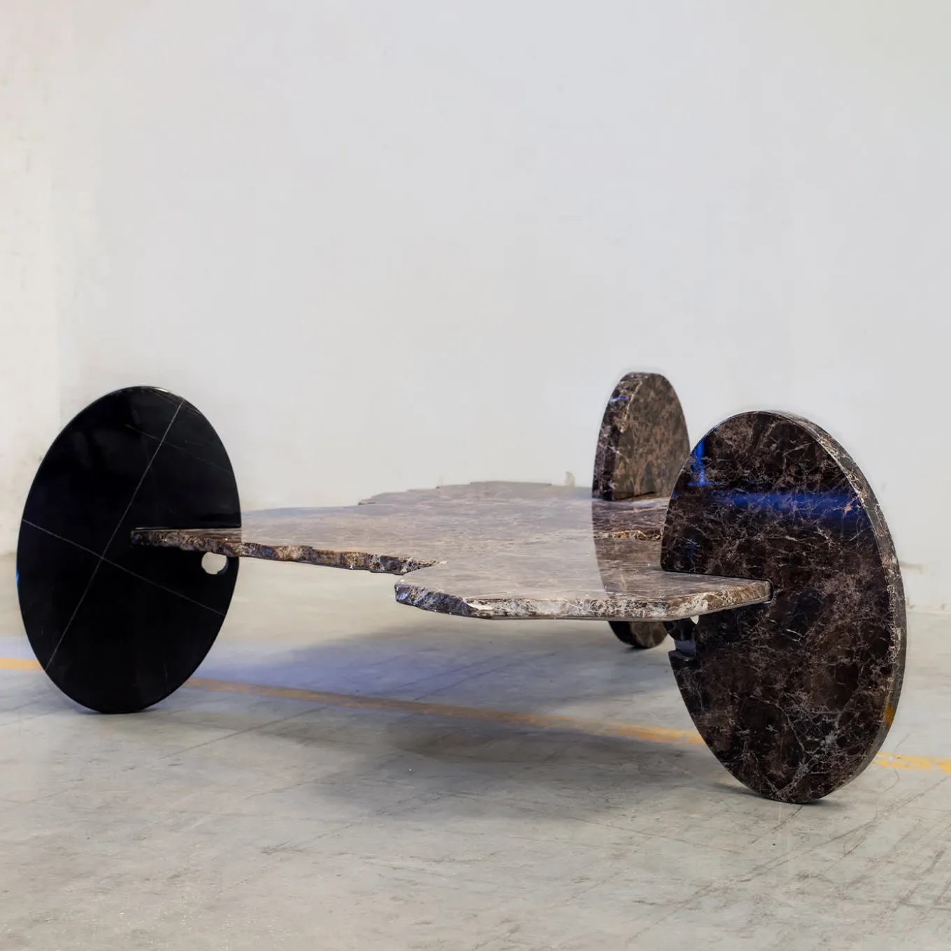 This exquisite coffee table showcases a striking asymmetrical tabletop and a dynamic silhouette, where geometric shapes merge seamlessly with a sophisticated color palette. The tabletop rests on three distinct marble elements, thoughtfully combined to highlight their unique textures and hues. Elegant oval legs at the base add balance and refinement, elevating the design to a masterpiece of modern luxury. Marble Structure: Emperador Dark | Toffee Brown Marble Top: Emperador Dark | Sahara Noir.