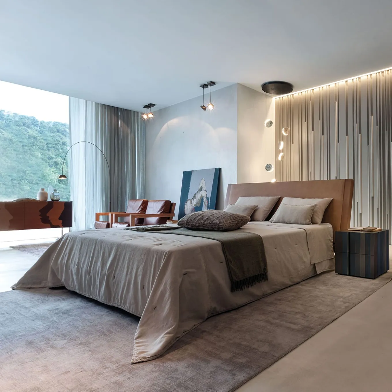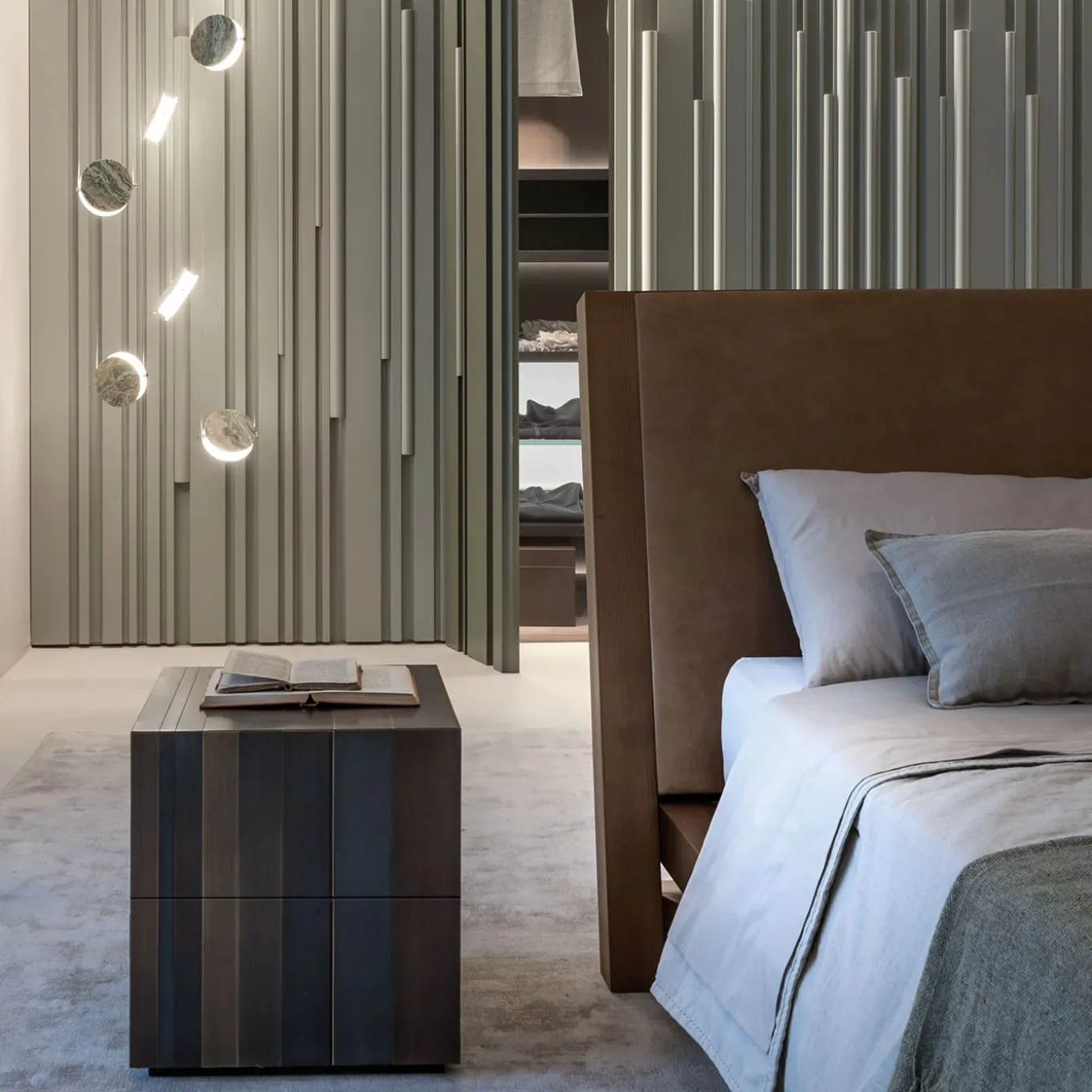 This bedside table combines bold materials with functional elegance. The front and side panels feature a striking burnished copper finish, while the walnut top and interior add warmth and texture. A black matte lacquered base provides a sleek foundation. Customization is available in polished steel, satin brass, and black iron, offering a variety of aesthetic choices. Please contact the Concierge for more details.
