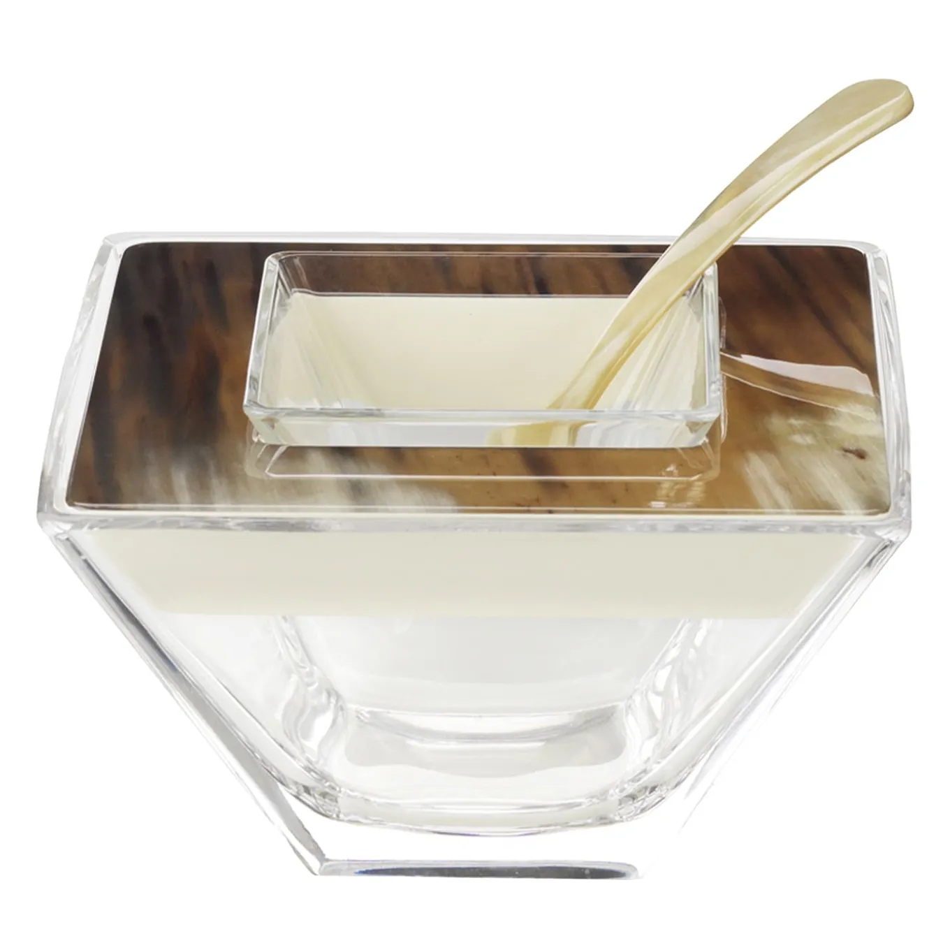 Geometric influences and precious materials make this caviar bowl an authentic tableware gem craved for accenting collections with unprecedented exclusivity. Supplied with a specific caviar spoon entirely crafted of horn, the bowl boasts a pyramid-like silhouette in clear Venetian glass luxuriously decorated with fine horn inlays for the top. A large version is also available in the Artemest catalog.