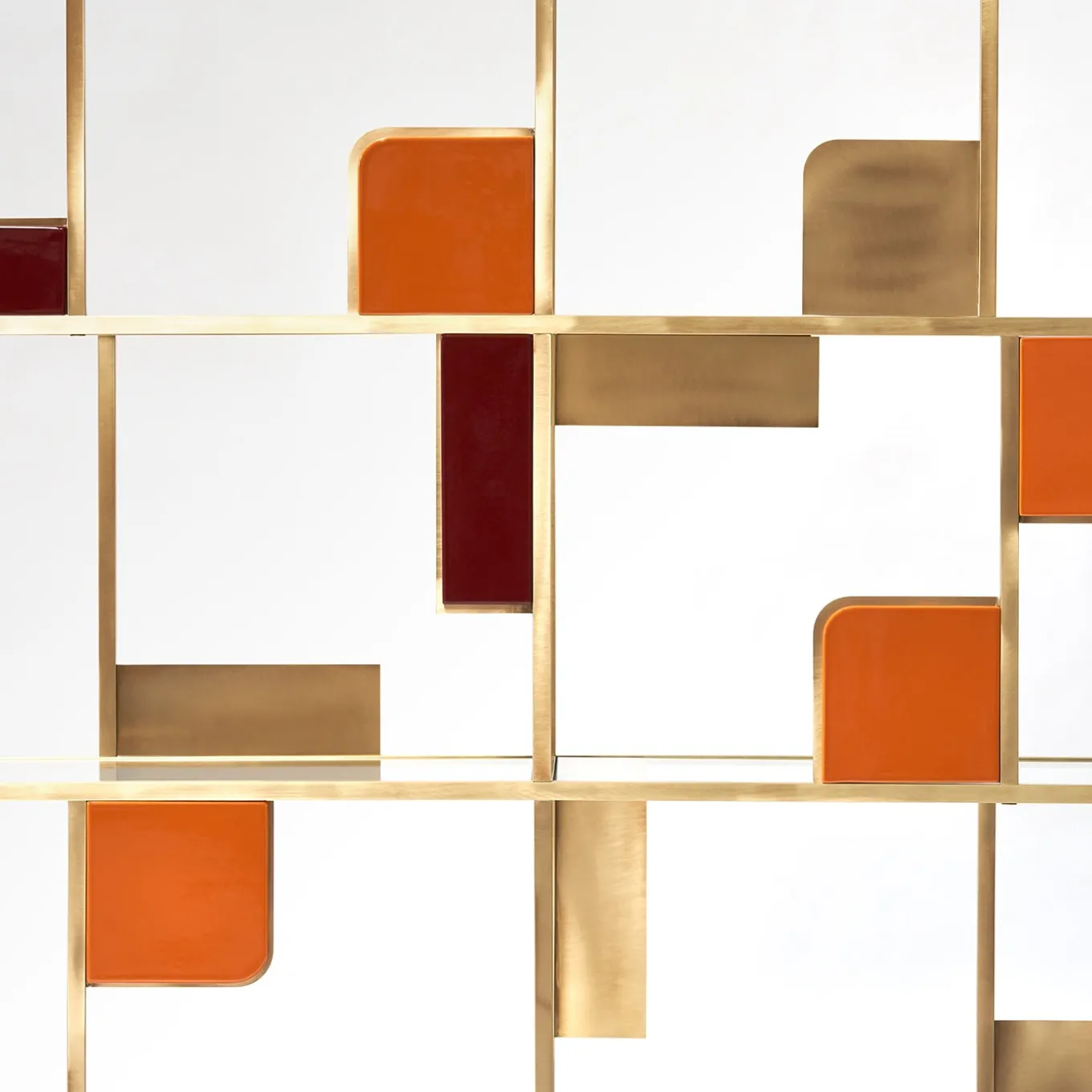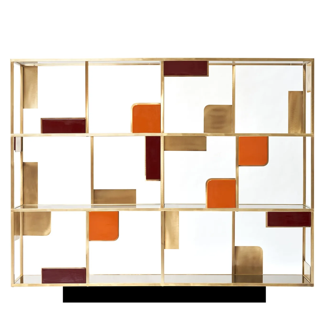 Part of the Sunset Collection created by La Récréation – P.Angelo Orecchioni architects, this extraordinary bookcase will add an accent of sophistication to a contemporary decor, especially if matched with others from the same series. Resting on a black brushed wooden base, it is enclosed in a brass structure with extra-clear crystal shelves and a bronzed mirror bottom. It is entirely decorated with geometric elements in enameled ceramic. Customizable upon request.