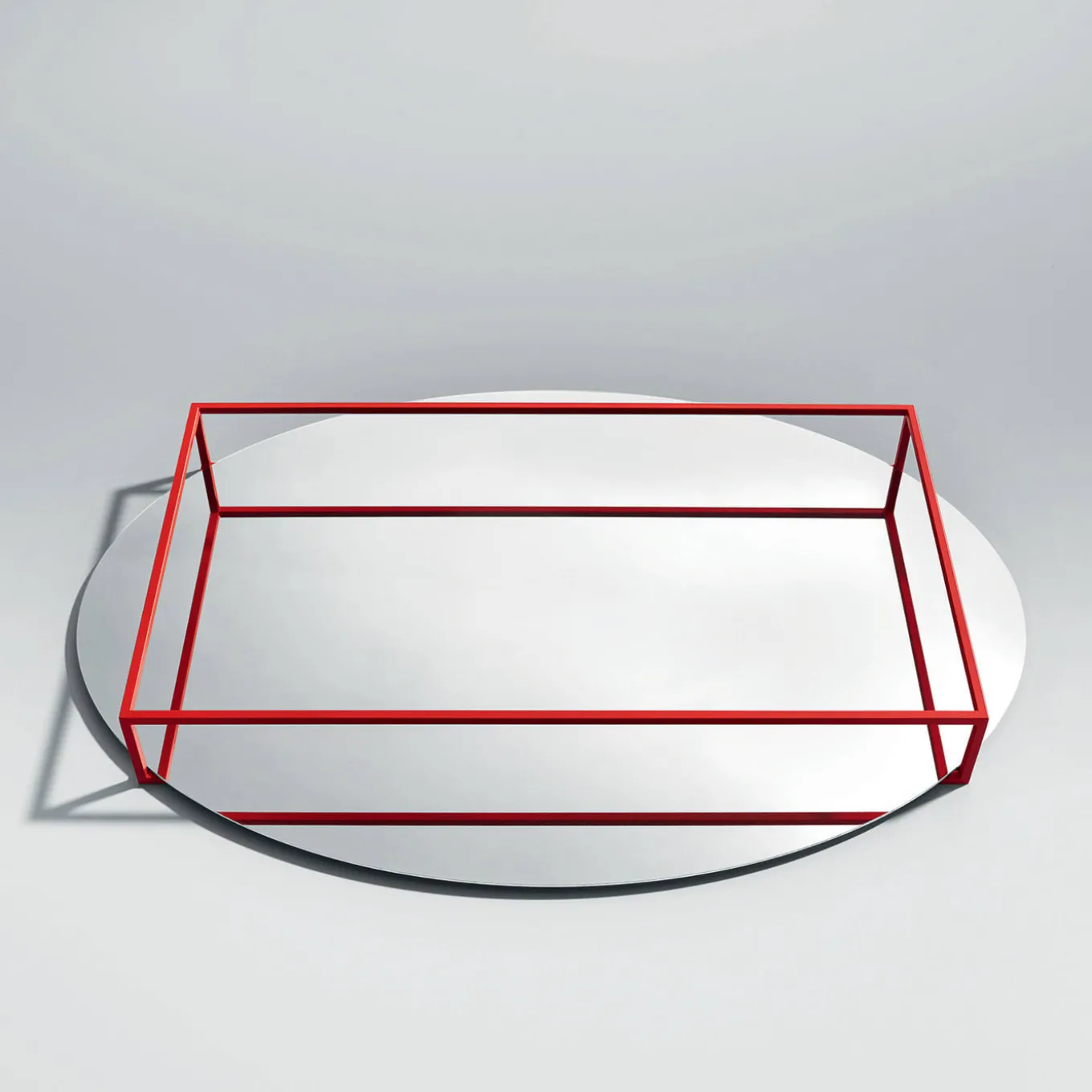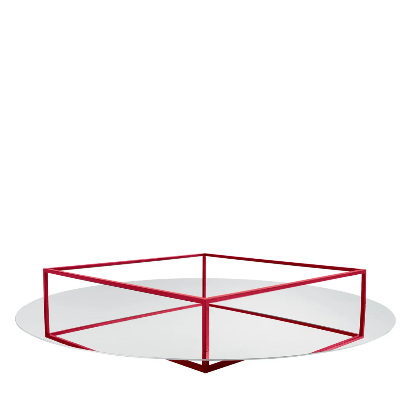 Taking advantage of pure geometries and of an intriguing visual effect of reflection, this fruit tray designed by Ron Gilad will elevate the style of any kitchen decor. A minimalist, red-lacquered metal frame outlines a fence-like design where fruits are gathered and reflected onto the circular mirror placed underneath.