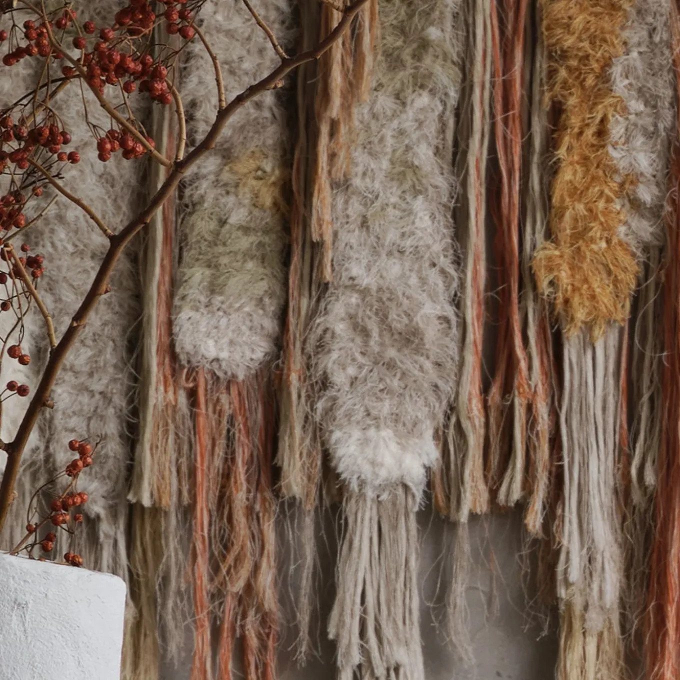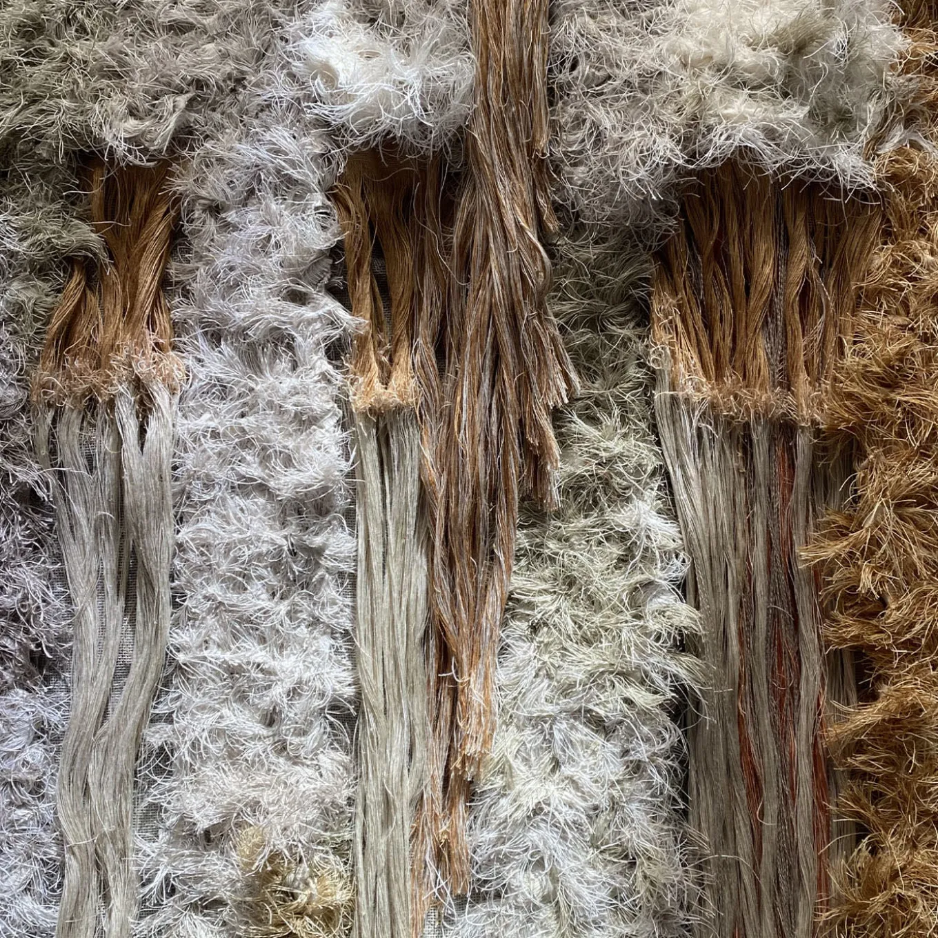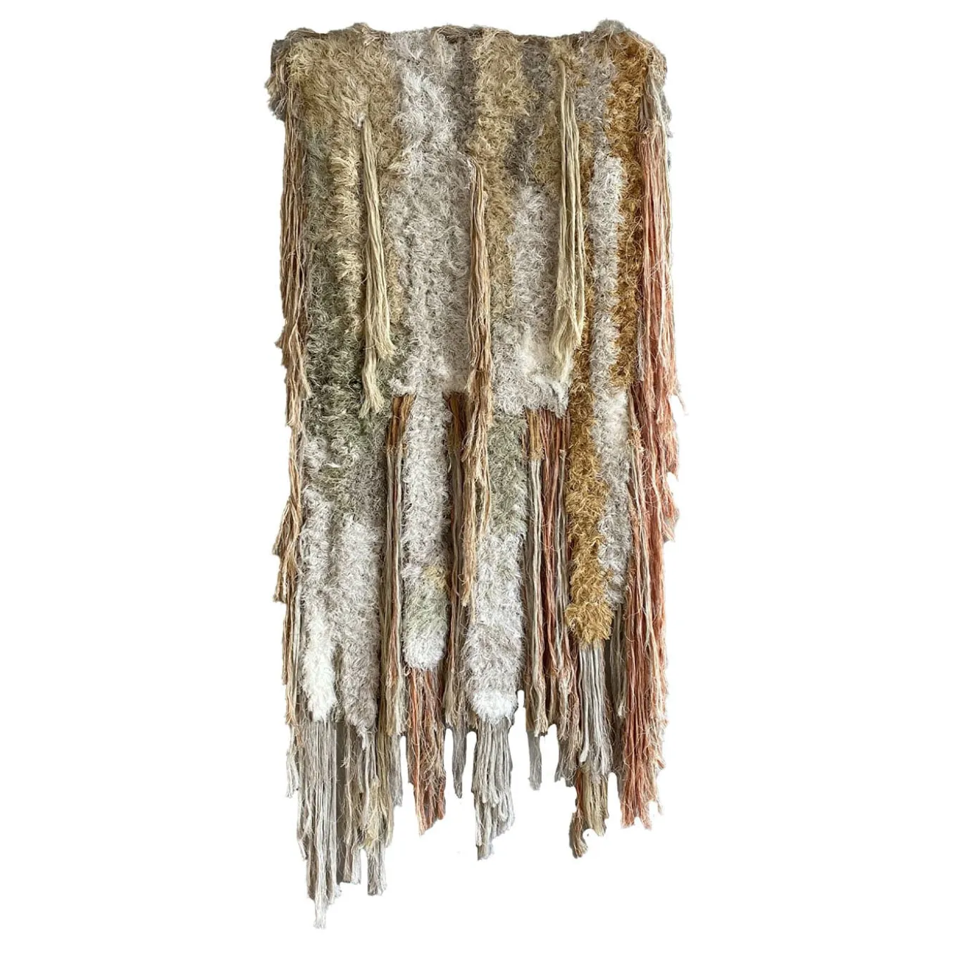 This singular tapestry is made with reclaimed Made in Italy threads and textiles as part of the Noloom collection (referring to the production process that does not use looms). Threads in yellow, orange, white, and light brown delicately interplay, the hints of green sealing its playful character. Presented at Galleria Paola Colombari in 2022 and Milan Design Week 2023. Equipped with a slit to insert a rod for hanging, not included with purchase.