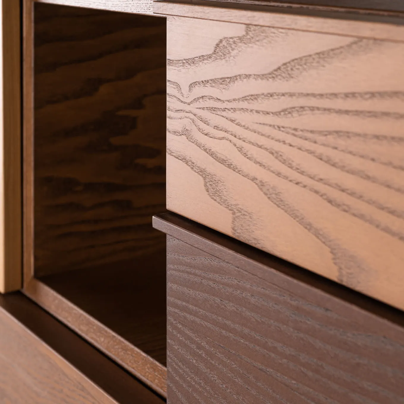 The perfect complement to the Swing Bookcase, this exquisite consolle will make for a distinctive and sophisticated accent to the entryway decor of a contemporary home. Handmade of ash wood, its architecturally-inspired shape features two drawers, two open compartments, one Vienna straw door, and one flap door. Please consult the Concierge for further details.