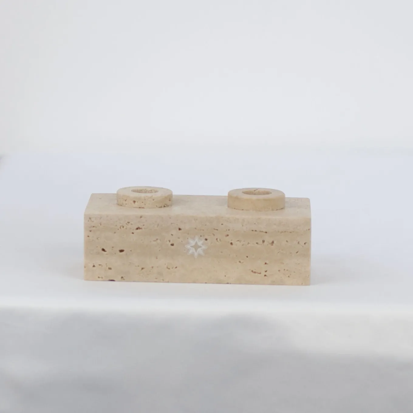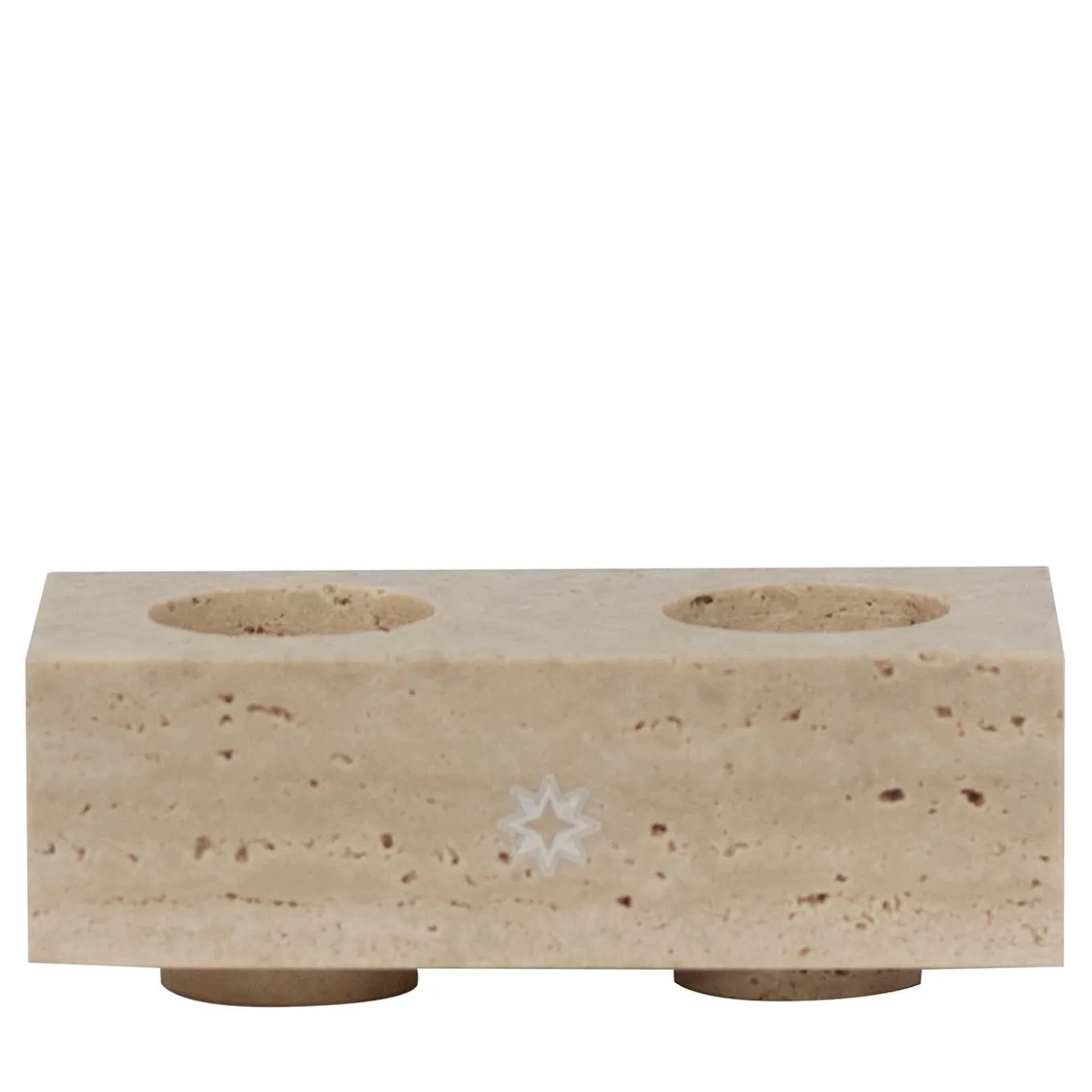 A satin-finish double squared holder crafted from beige Travertine marble, designed to accommodate both candles and tealights. Featuring a minimalist rectangular form with two recessed circular compartments, this piece belongs to a versatile collection offered in a variety of marble types. Its modular design allows for multifunctional arrangements, bringing a subtle, elegant touch to any home décor.