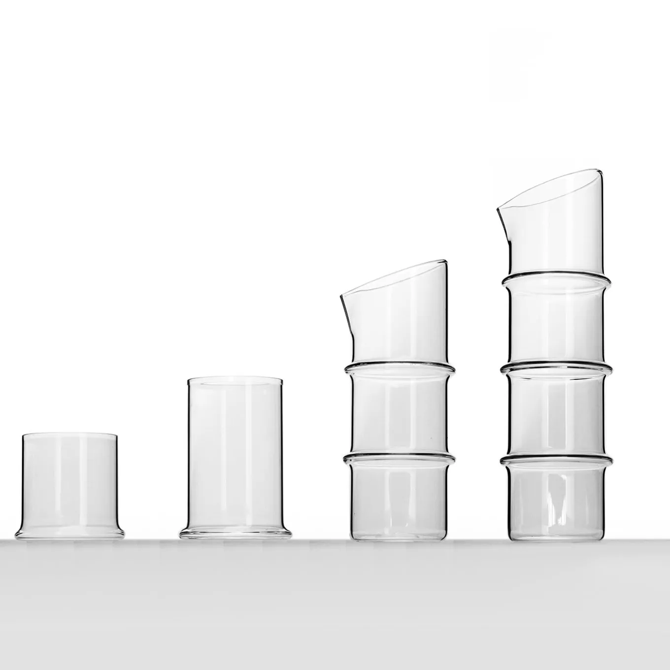 An exercise in sophisticated minimalism, this carafe was crafted of borosilicate glass and shaped by hand. The three rings that adorn the elongated cylinder of its frame are not mere decorations, but function also as measurement tools, since the first shows the 25 cl limit, the second 50 cl, and the third 75 cl (the equivalent of a bottle of wine). Evoking the shape of a bamboo cane in traditional Japanese fountains, this design is elegant and modern and will make a statement both on the dining table and as a display item in the living room or entryway.