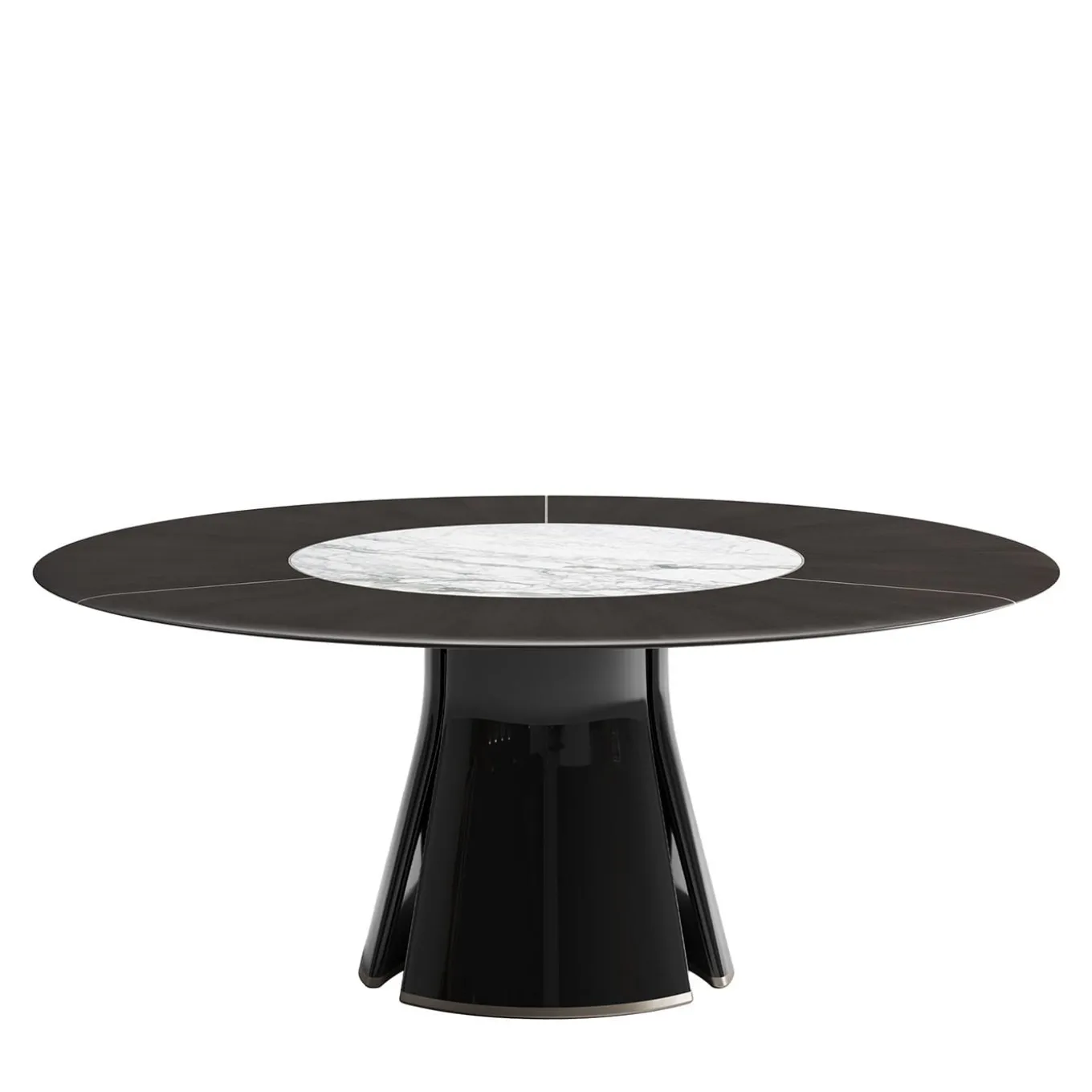 Elevate the space with theround dining table. The top features inlayed black eucalyptus, exuding luxury and sophistication. A lazy Susan in stunning Smooth Arabescato Corchia marble adds functionality and elegance. The glossy black lacquered base completes the sleek, modern design.