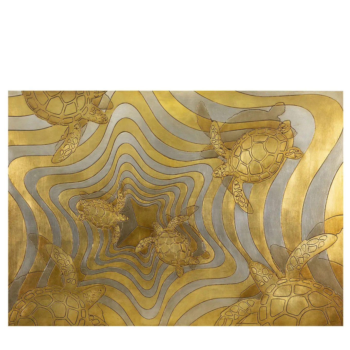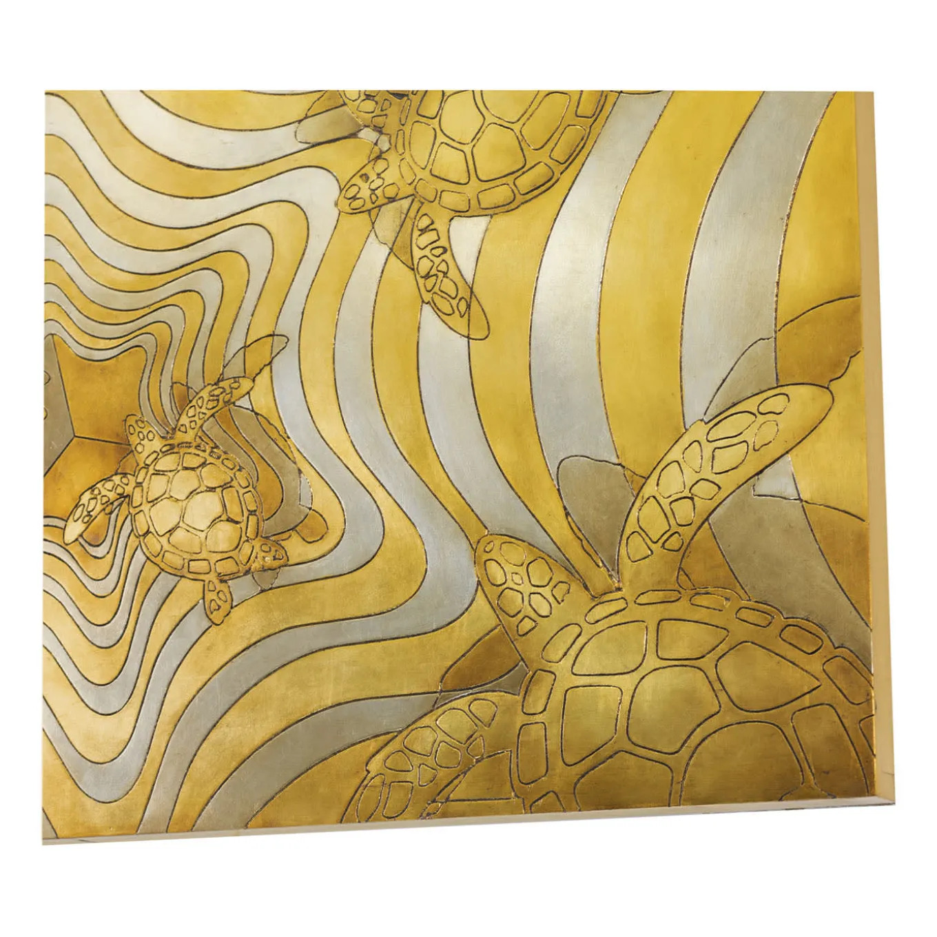 Poetic metaphor for the worrying status of endangered turtles, this one-off decorative panel combines the shimmering quality of gold and silver leaf to the dynamism of a minutely hand-carved plastered design. Turtles are captured as seemingly suck down a vortex, which consists of hexagonal elements with curved, deformed profiles for rendering an hypnotizing effect of authentic movement. A final layer of oil colors seals the design. The artwork is delivered with a certificate of authenticity.