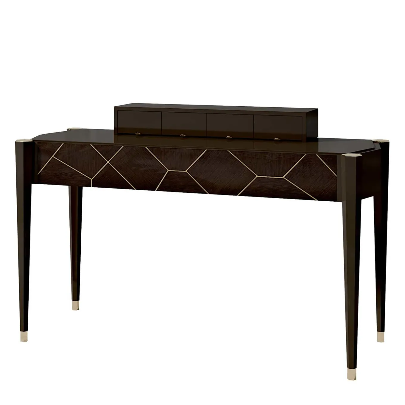 The Temptation vanity features one drawer with brass details and a wooden top. With its iconic shape almost like a diamond, enriched by the use of “Lati” exotic wood on the drawer. The irregular decorations are hand-engraved, fulfilled with liquid brass metal finishing. All is completed by galvanic gold metal details on the upper and bottom part of the legs. Inside the drawer there is an upholstered jewelry holder, and on the top there are four small drawers for some extra storage space. Marble top is also available. Please ask Concierge for details.