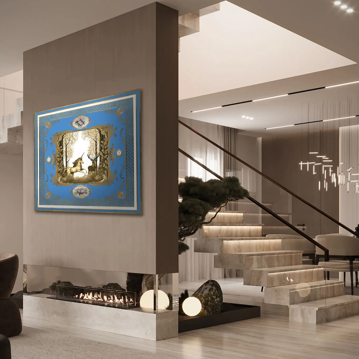 A true homage to baroque opulence, this decorative panel is a testament to Italian craftsmanship. Created on Orobond aluminum, the composition is accentuated by hand-applied gold powder, elevating its elaborate details. The relief technique brings depth and texture, making the motifs appear sculpted. A glossy finish highlights the intricate patterns, enhancing their brilliance. This piece merges historical grandeur with contemporary luxury, making it an elegant focal point.