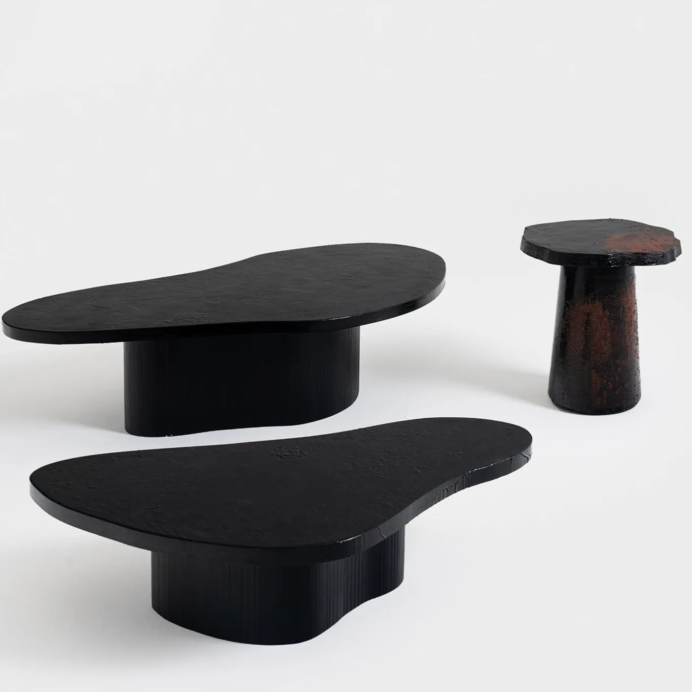 This coffee table, part of ROU Materiaal’s Tassella Collection, features an organic, asymmetrical shape with a surface that mimics the texture and depth of stone. Composed through layered and removed stratifications, the table highlights natural imperfections enhanced by contemporary finishes like fire, sand, gilding, and resin. Designed for mosaic composition with other sculptural pieces from the series, it combines historic tree wood with innovative treatments for a striking, tactile presence.