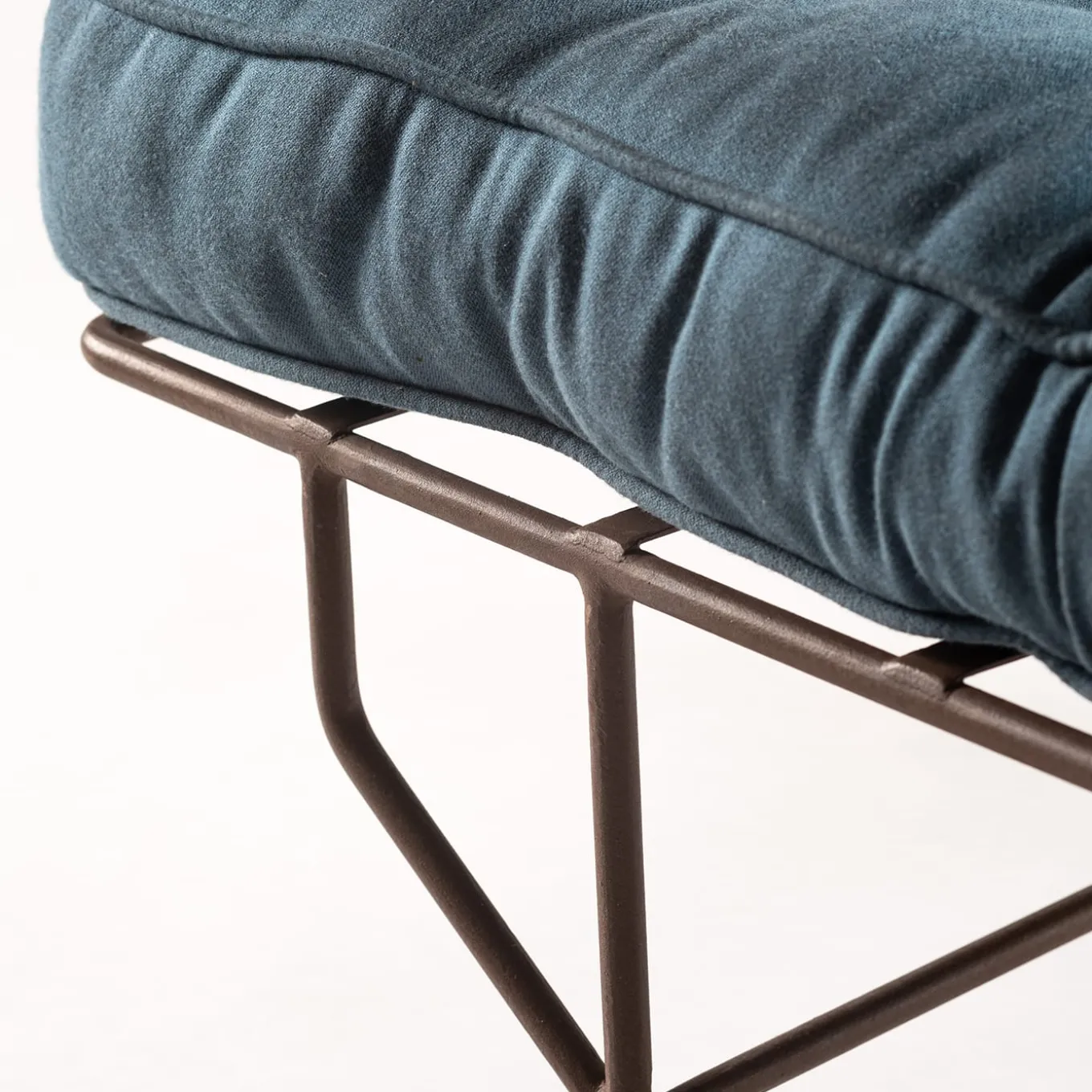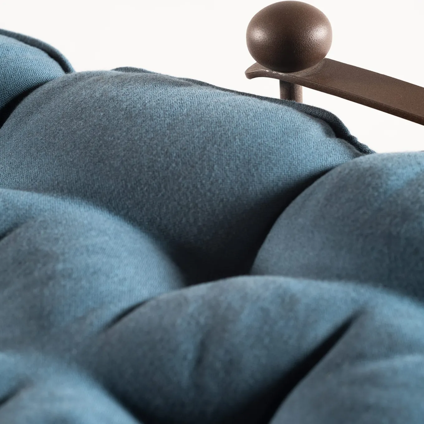 Taking a nap in the middle of a blooming garden while not renouncing comfort is possible with this precious chaise longue of 18th-century inspiration designed for outdoor use. The airy steel frame is coupled with a generously padded mat enveloped in a blue cover adorned with a tufted design. The backrest can be adjusted and wheels ease the design’s repositioning.