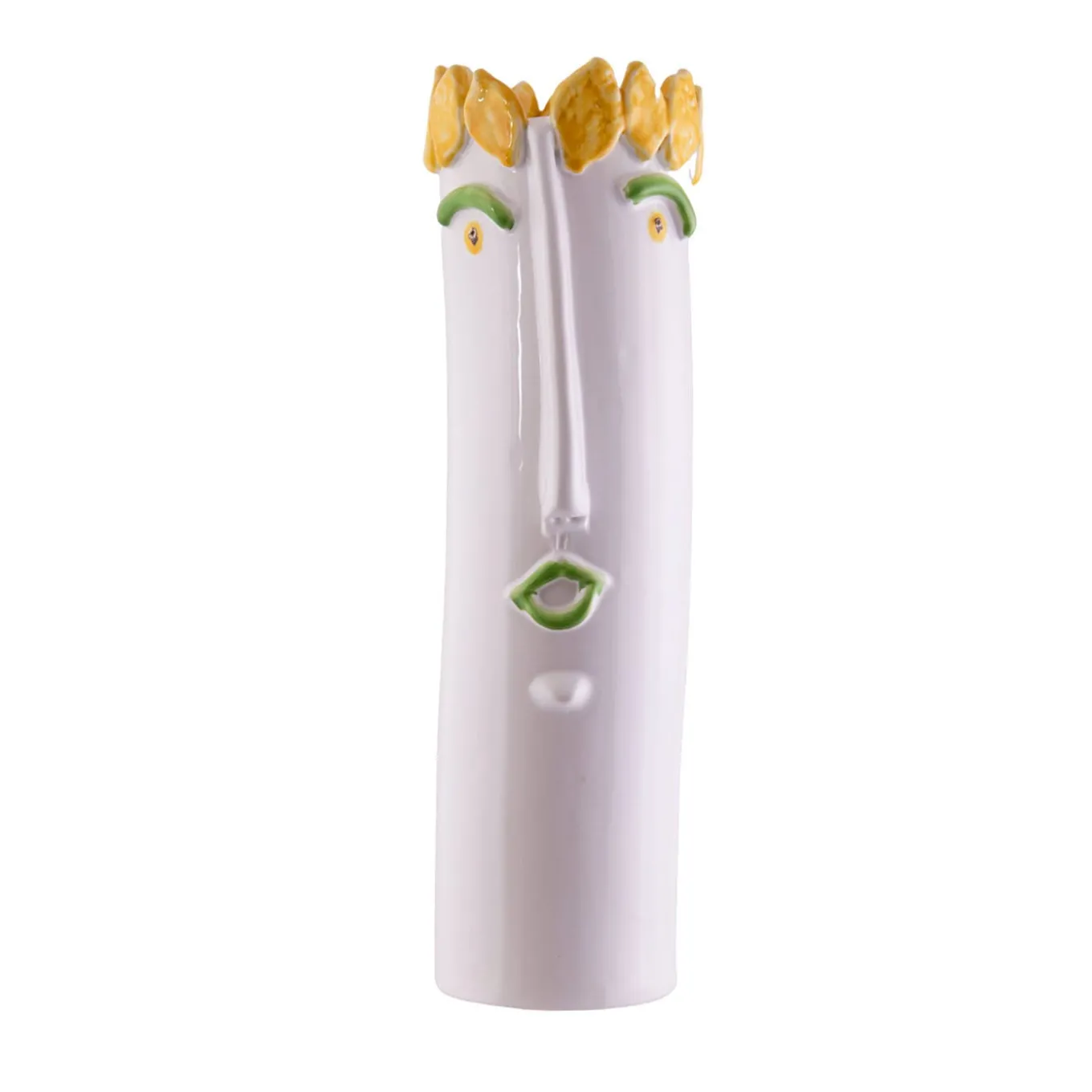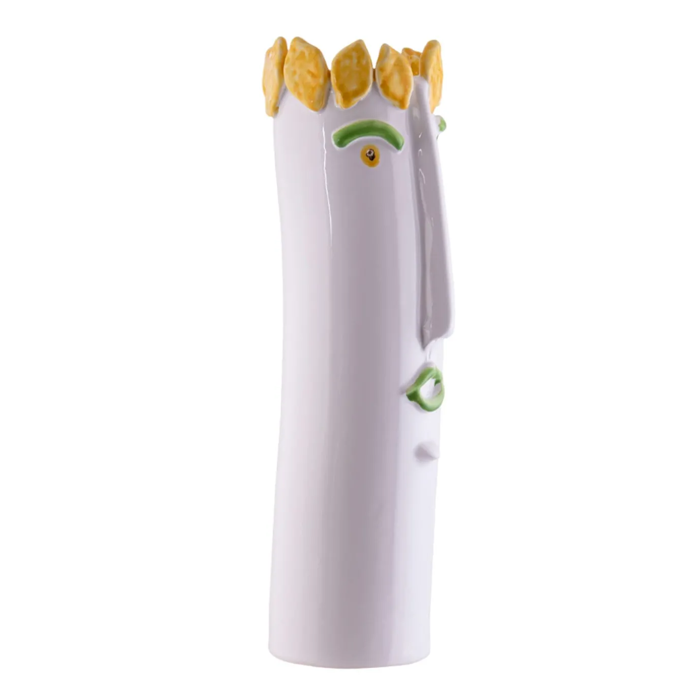 The Lady of the Lemons is an exquisite decorative vase crafted in white ceramic, boasting a glossy white glaze and adorned with a charming face and lemon motifs. This versatile piece is not only visually captivating but also functional, as it is water-safe and suitable for holding fresh flowers. Its intricate design, featuring a delightful combination of a glossy finish and lemon decorations, transforms it into an elegant and versatile vase.