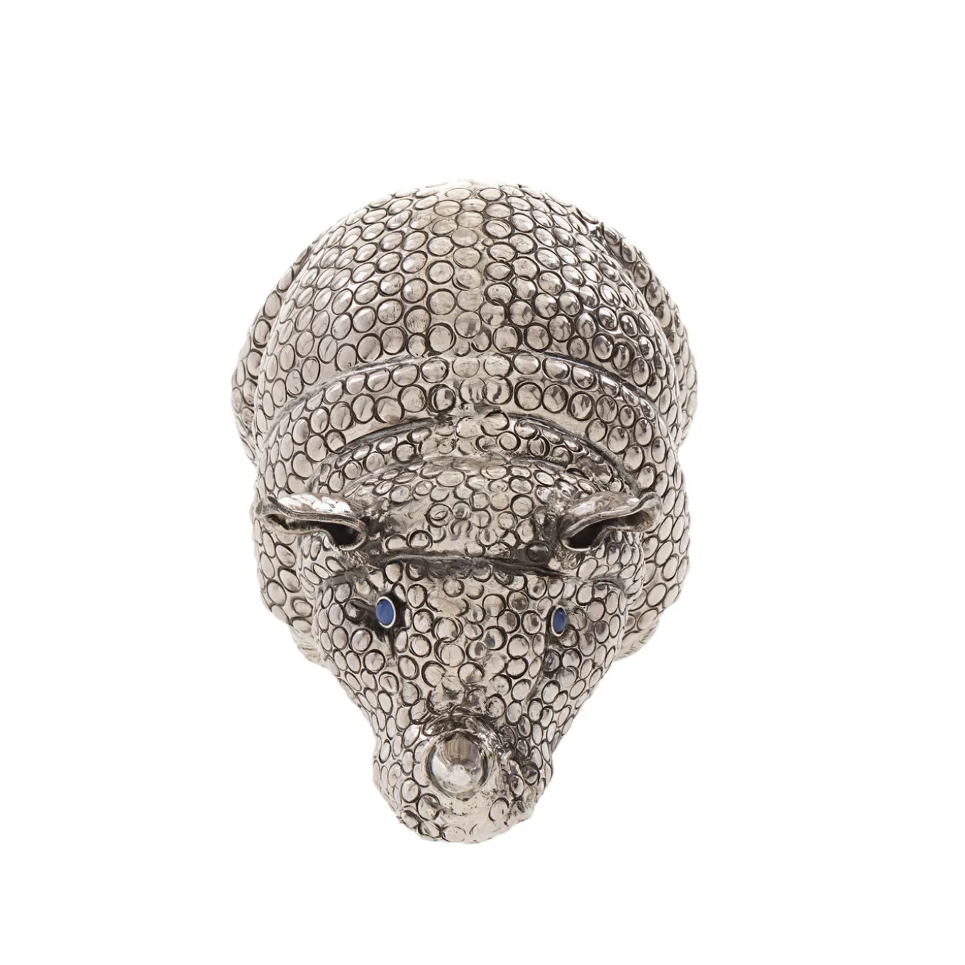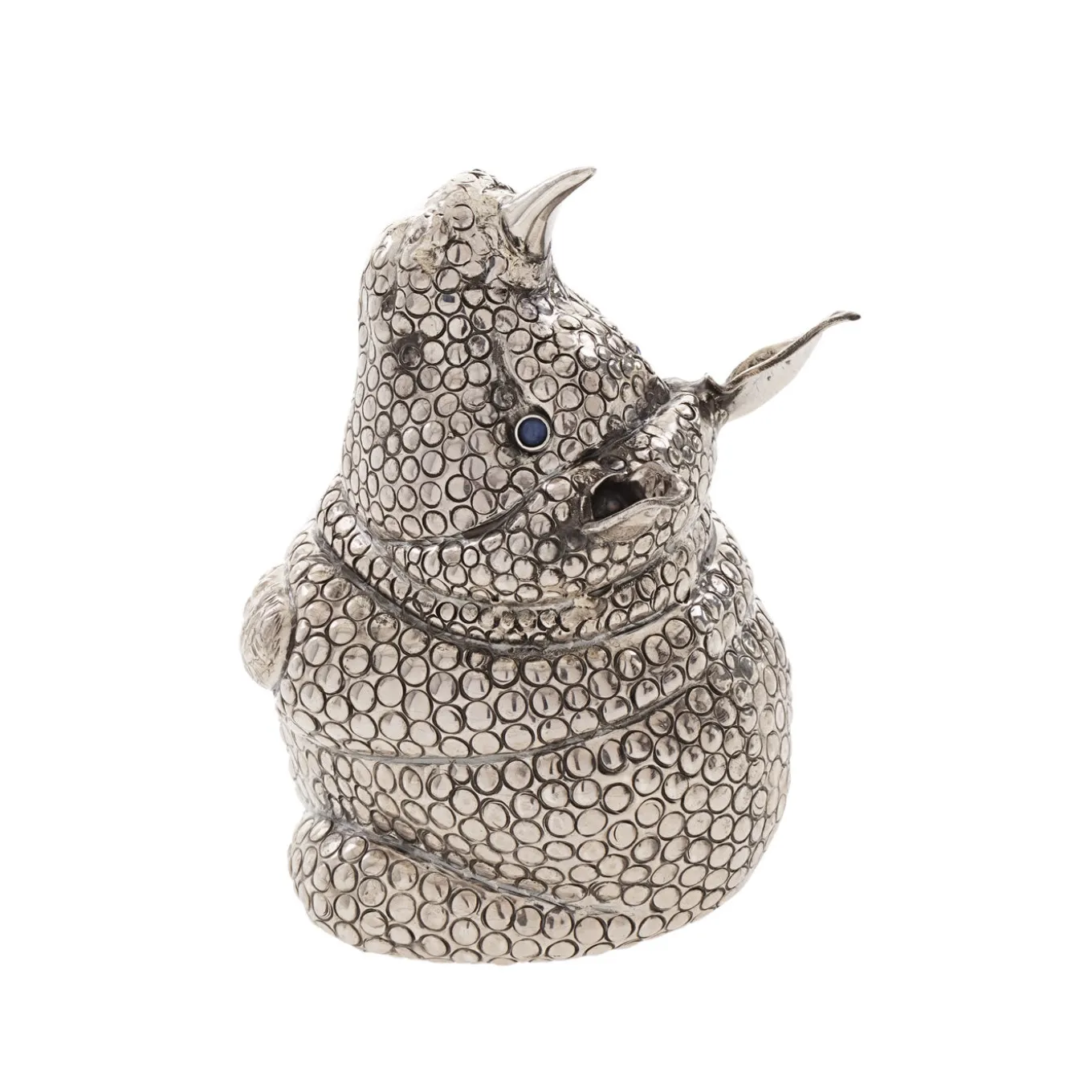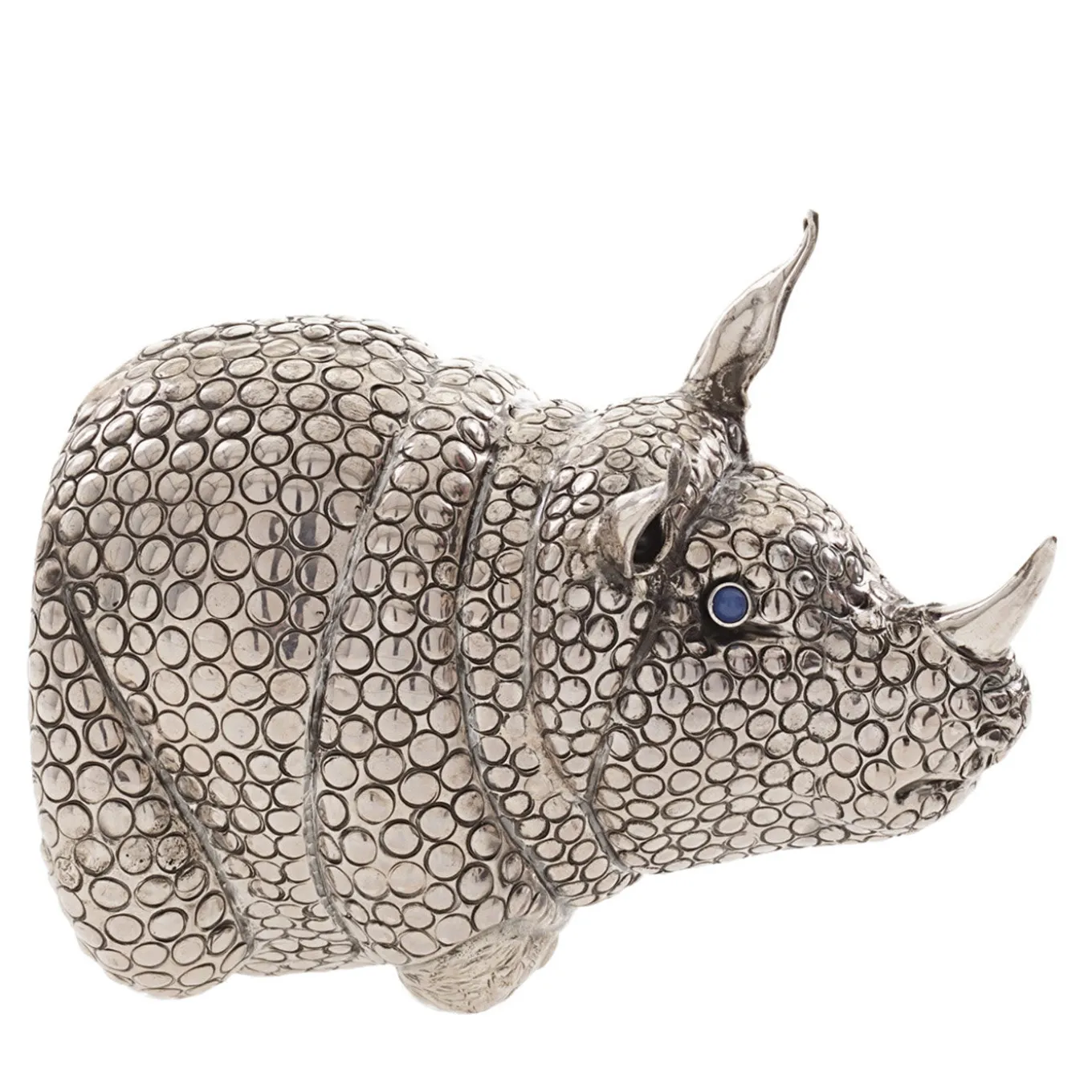 Playful true-to-life silver rhinoceros that serves as a lighter other than being a decorative artwork in its own right. Expertly handcrafted by the Florentine silversmiths, the Lisi brothers, its realism and expressive quality make it a very lively piece.