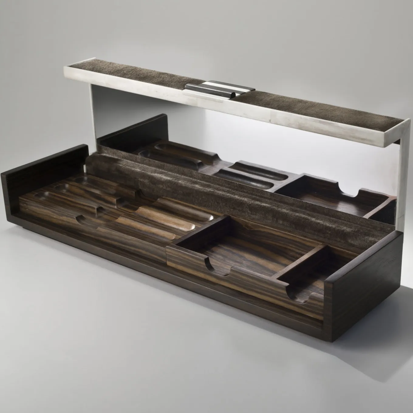 This elegant pen tray in ebony wood with horn accents in contrasting color and nubuck leather features an interior compartment with a pen tray and a storage section for business cards and post-its. The interior of the lid is covered with a mirror.