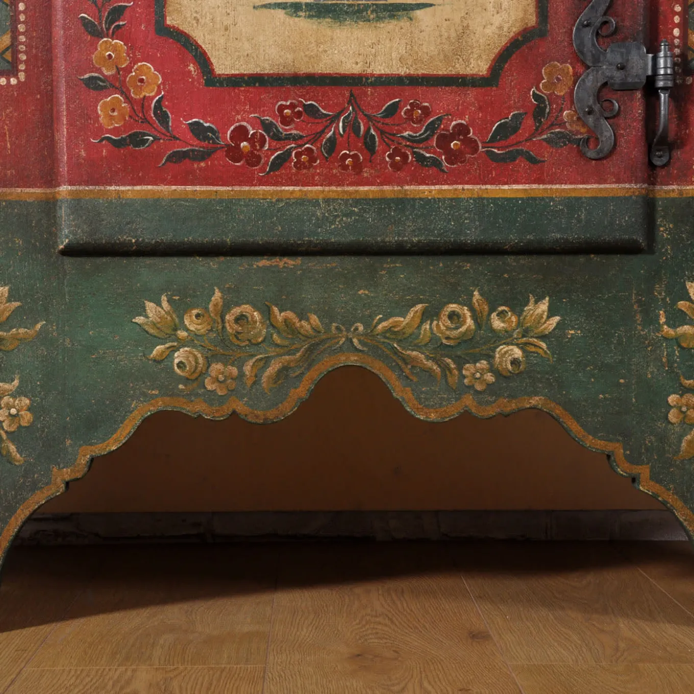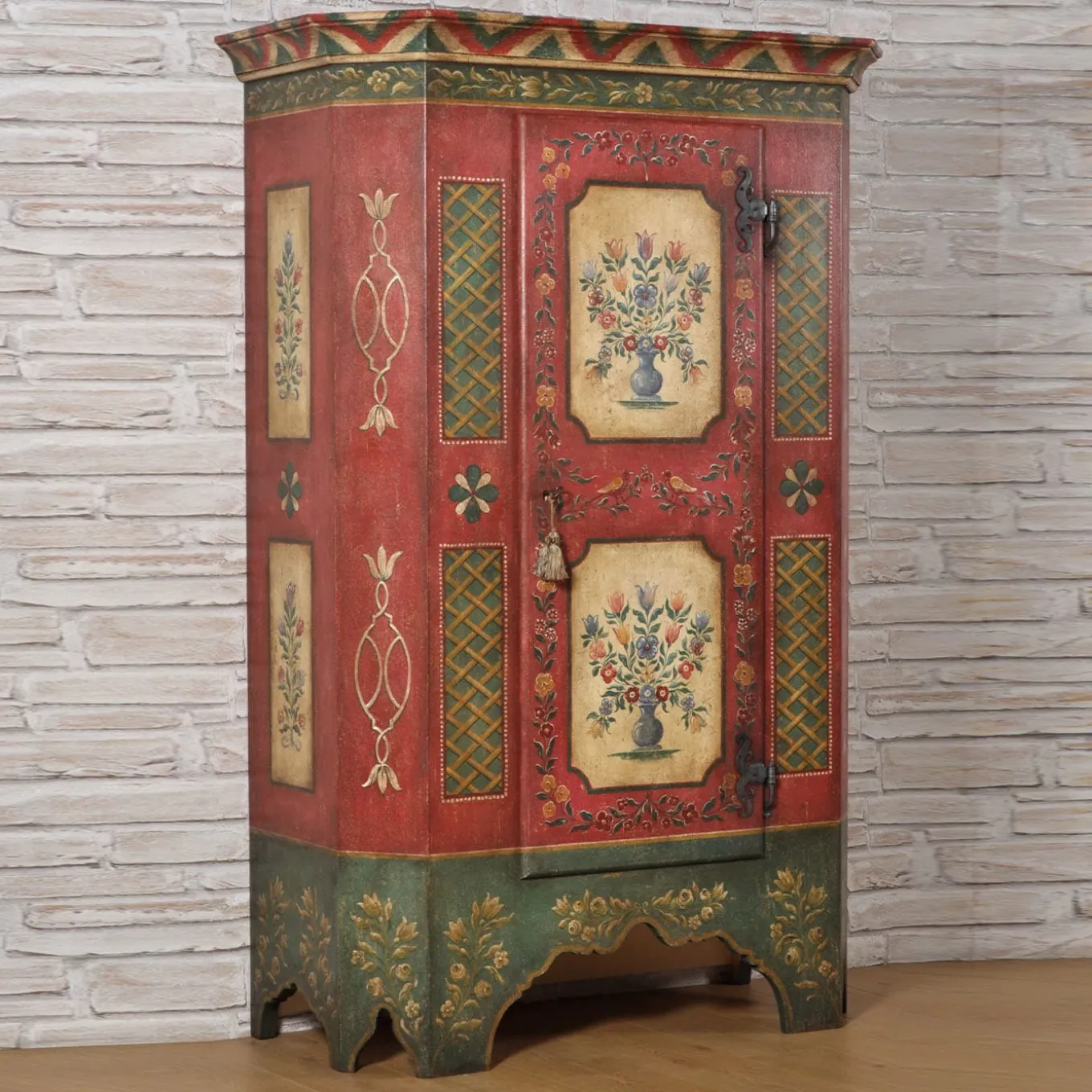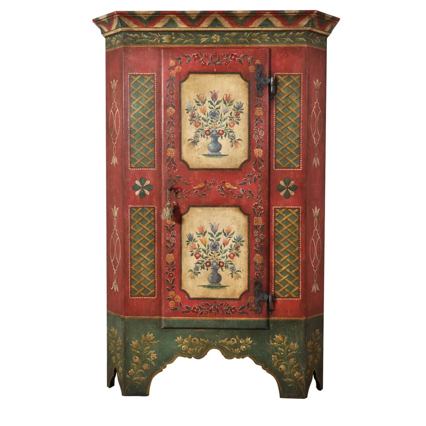 A daring combination of minute Baroque, floral, and geometric decorations states the inebriating decorative charm of this artisan wardrobe. Faithful reproduction of an original design from the early 18th-century Baroque Tyrolean style, its singular look results from only water-based tempera paints applied with deft brushstrokes. Completed by hand-forged iron hinges and lock, it can be customized upon request to the Concierge.