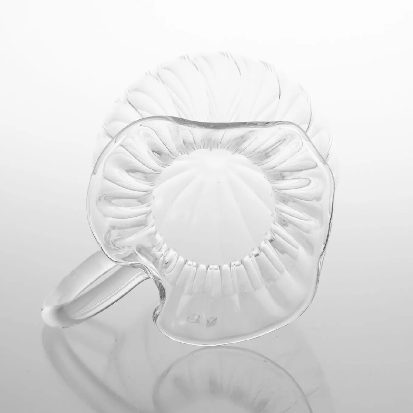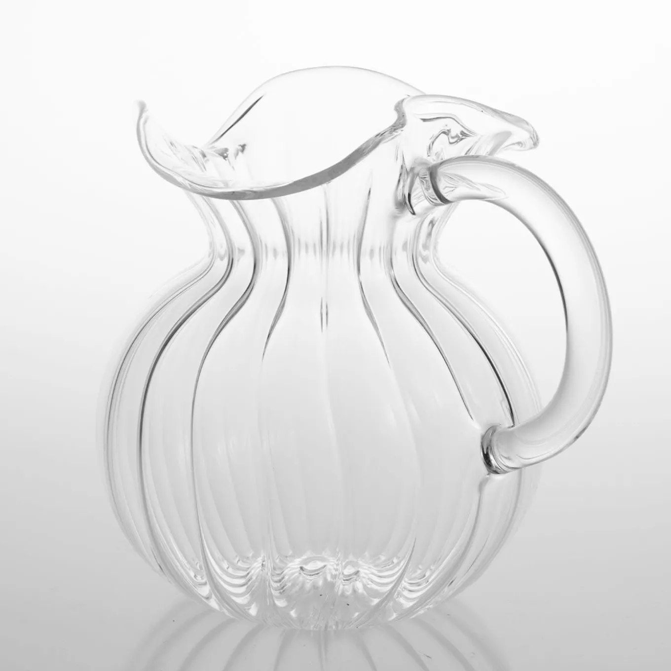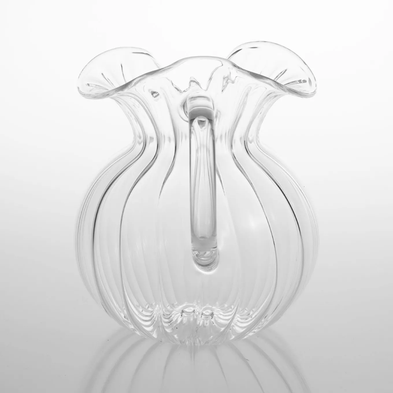 Handcrafted without molds, this transparent pitcher draws inspiration from the Venetian tricorne hat with its distinctive three-lobed shape. Made from lightweight borosilicate glass resistant to thermal shock, it can be used on flames and cleaned in dishwashers. Historically popular in Venetian inns of the 1900s to mix and serve sparkling cocktails like Bellini and Rossini. A practical and elegant addition for serving chilled and sparkling beverages.