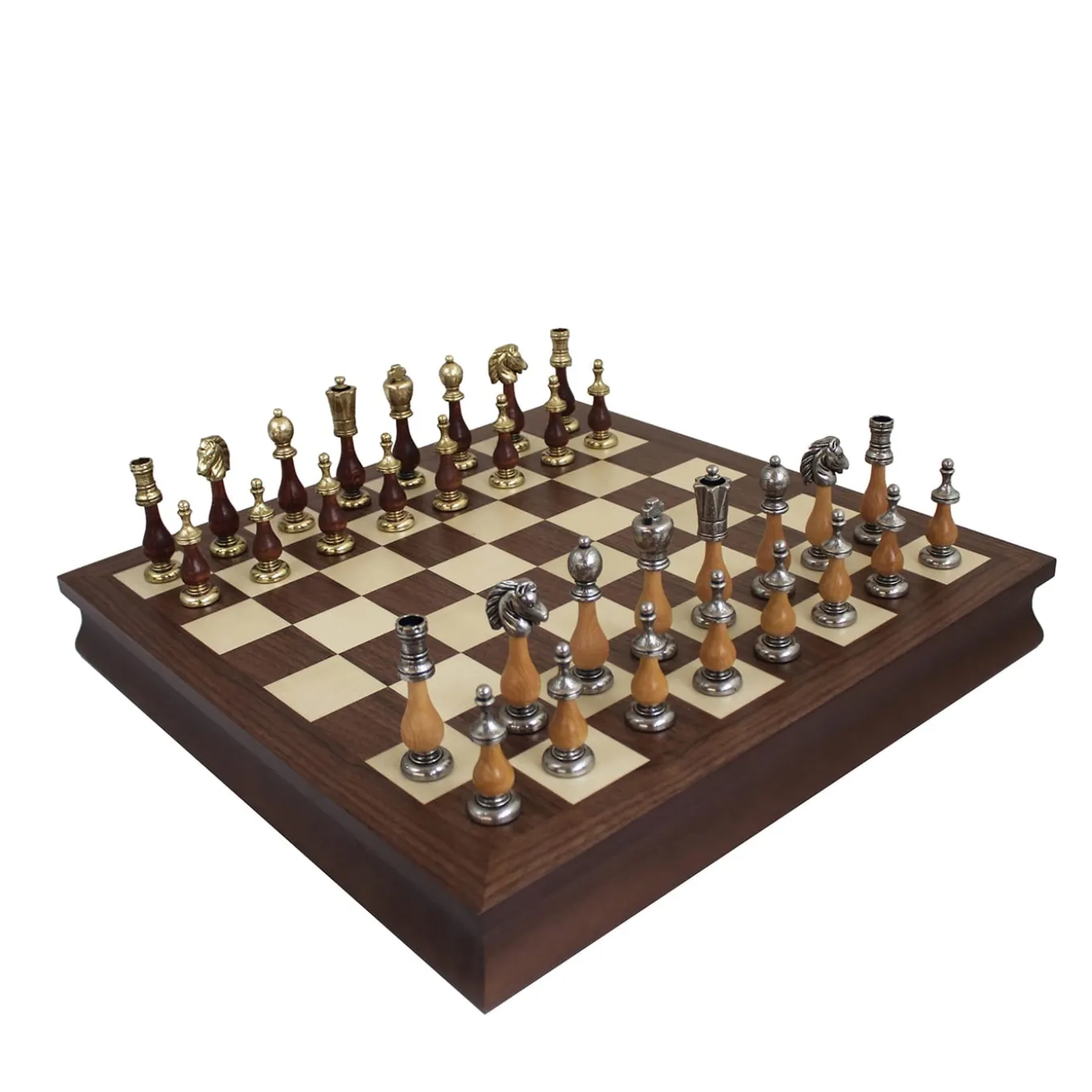 A testament to traditional Italian style, this chess set boasts a precious design of manual inlays combining prized walnut and maple. Spot-on addition to classic interiors, it counts singular chessmen crafted of metal and wood and a unique chessboard – measuring cm 50x50x7 – equipped with a container for chess pieces. Kings are cm 10 high.
