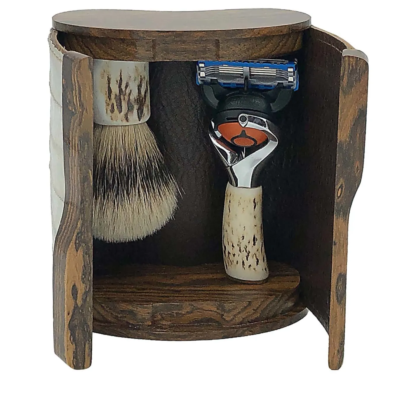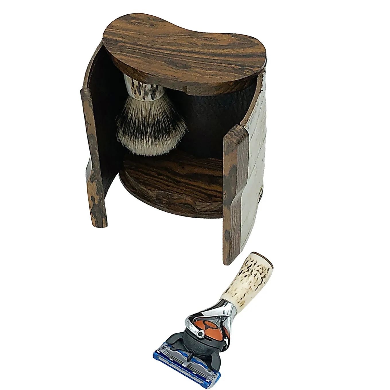 The ideal gift for an elegant man on the go, this exclusive beard set includes a shaving brush (ø 20 cm) and a razor enclosed in an elegant box handcrafted of bocote wood enriched with an outside layer of white eel skin. Featuring both an exquisite handle of genuine antler horn, the brush has soft bristles of “silvertip” badger and the razor a Gillette Flexball head. Customization is available both for the wood essence and the leather color (orange, brown, and matte black).