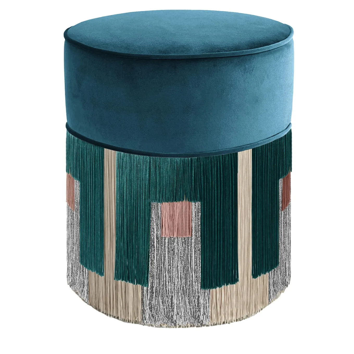 The Treasure Collection by Lorenza Bozzoli Couture seems to be coming straight out of the roaring twenties Art Deco. Beautifully balanced, geometric, and symmetrical, it is enriched by bold and contrasting colors recalling diamonds, combined with softer and paler ones, creating a sense of class and elegance. What is never missing are the luxurious and sophisticated metallic accents, reminding of rich and luscious jewels combined with the plush velvet. Each bespoke piece is stamped on the bottom of the pouf’s lining and personally signed, numbered, and dated by designer.