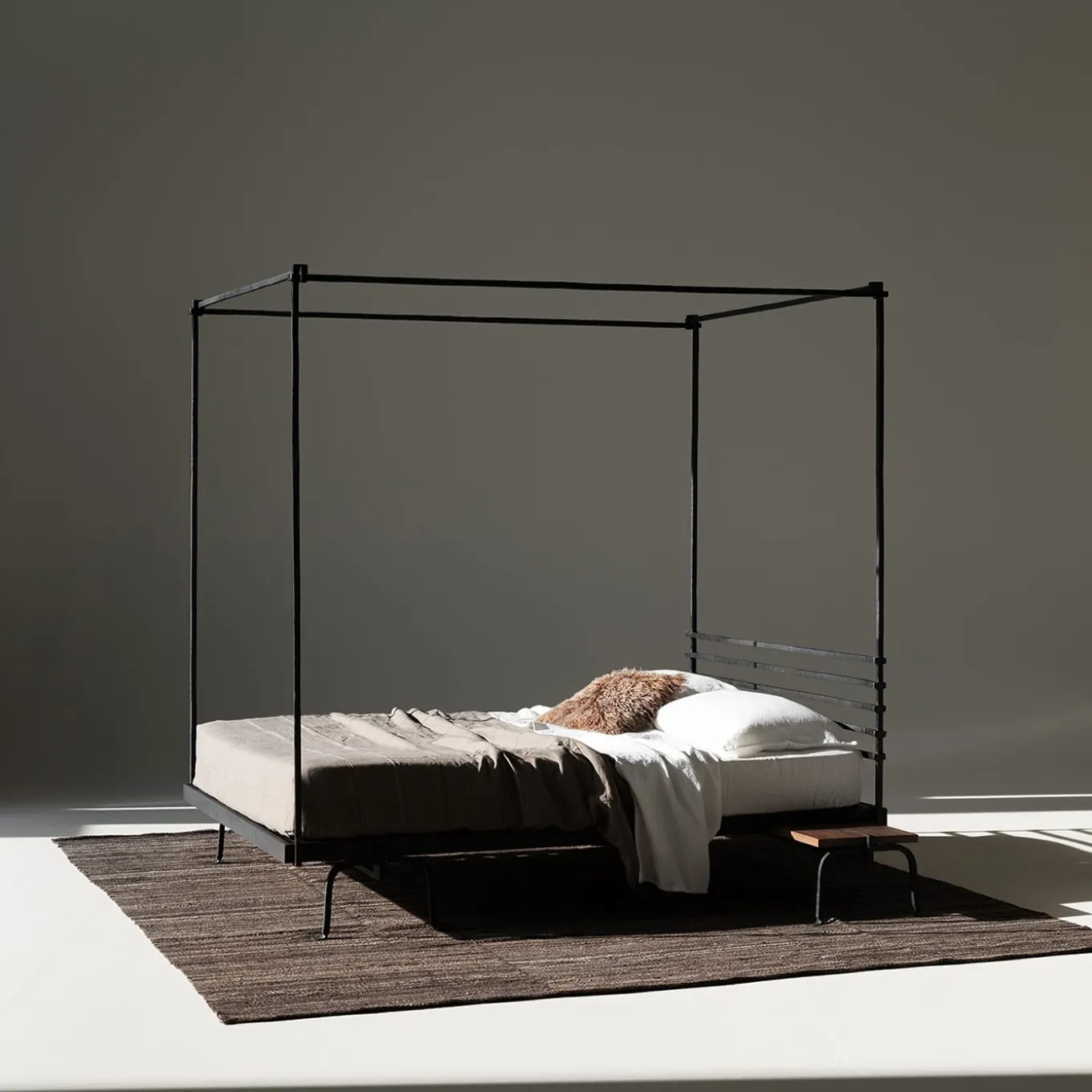 Restrained profiles of square-cut wrought iron define the airy and rigorous structure of this canopy double bed, which flaunts a kind twist with its sinuous feet celebrating the ancient Sicilian tradition of using trestles for raising wooden boards serving as the bedframe. The bed’s clever contemporary spirit is revealed with the built-in nightstands outlined by the linear wooden board that extends beyond the headrest’s extremities. Forged by hand, each bed is unique.