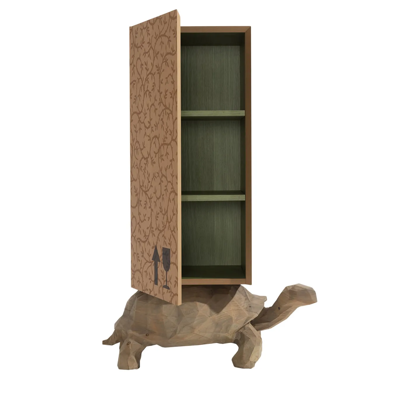 Part of the Wooderkammer Collection produced in a limited edition of only eight, this unconventional sculpture-cabinet is a statement-making piece composed of two contrasting elements. The turtle is entirely hand-carved from a single section of a tree trunk and supports a tall wooden case embellished with an exquisite inlay of sinuous branches executed entirely by hand. The interior is finished in olive green and the exterior features the fragile icon sign on one side, the artist logo and item number on the other, and “Handle with Care” in front.