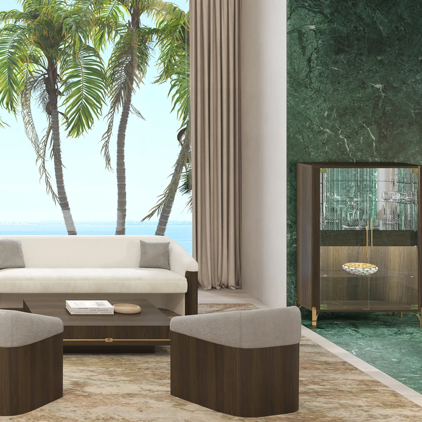 Two-door bar cabinet featuring a strong architectural design with a lacquered drawer subdivided for optimal organization. Equipped with curved transparent glass shelves and an LED spotlight that enhances display items. The upper back panel is upholstered with fabric, adding texture contrast, while metal feet provide stability and a modern touch. This cabinet accommodates cocktail accessories and glassware, merging function and style seamlessly.