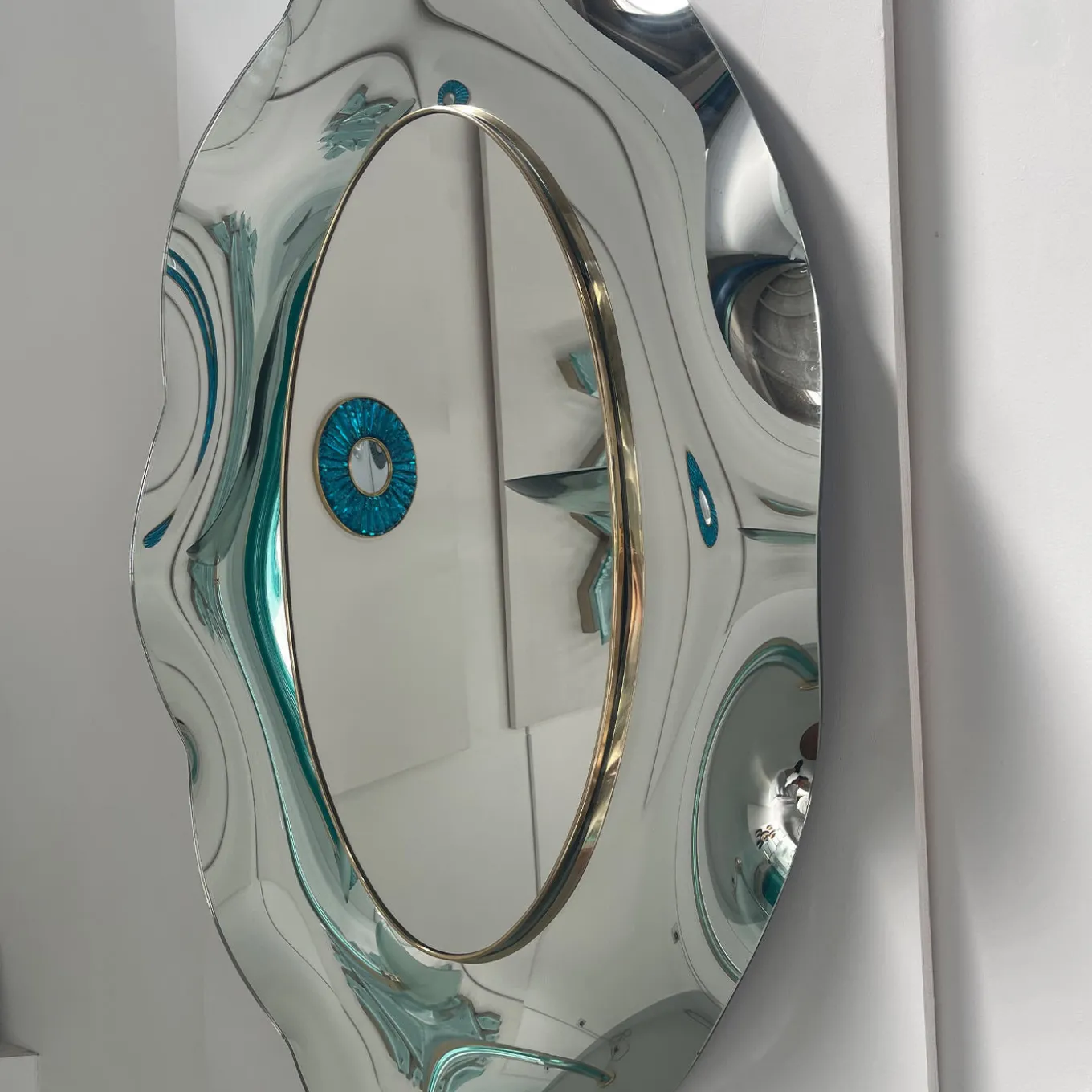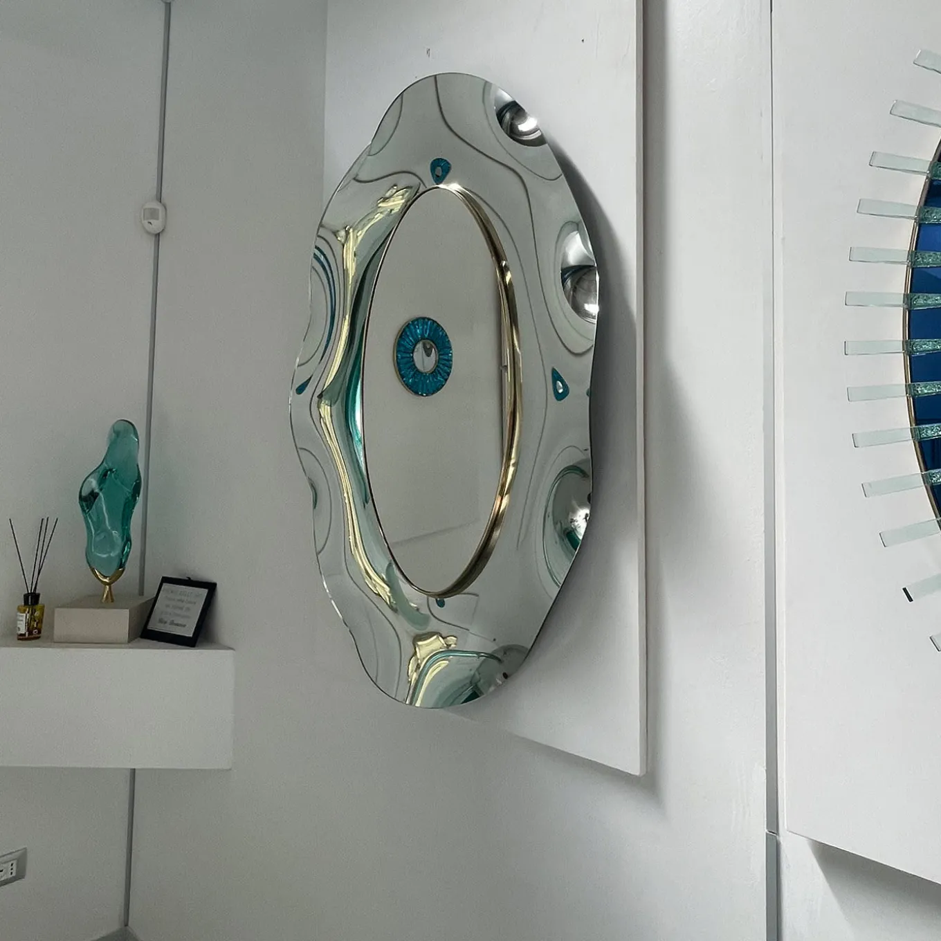 The ‘Undulate’ wavy mirror is the perfect synthesis of timeless style, innovative design and Italian craftsmanship excellence. The crystal has been hand-worked and expertly curved by the artist. The support structure is made of wood and brass. The metal is 24-carat gold plated and the oval shape and silver finish gives elegance and brightness. Every imperfection is a guarantee of extreme naturalness and craftsmanship. Due to handcrafting, slight changes may occur.