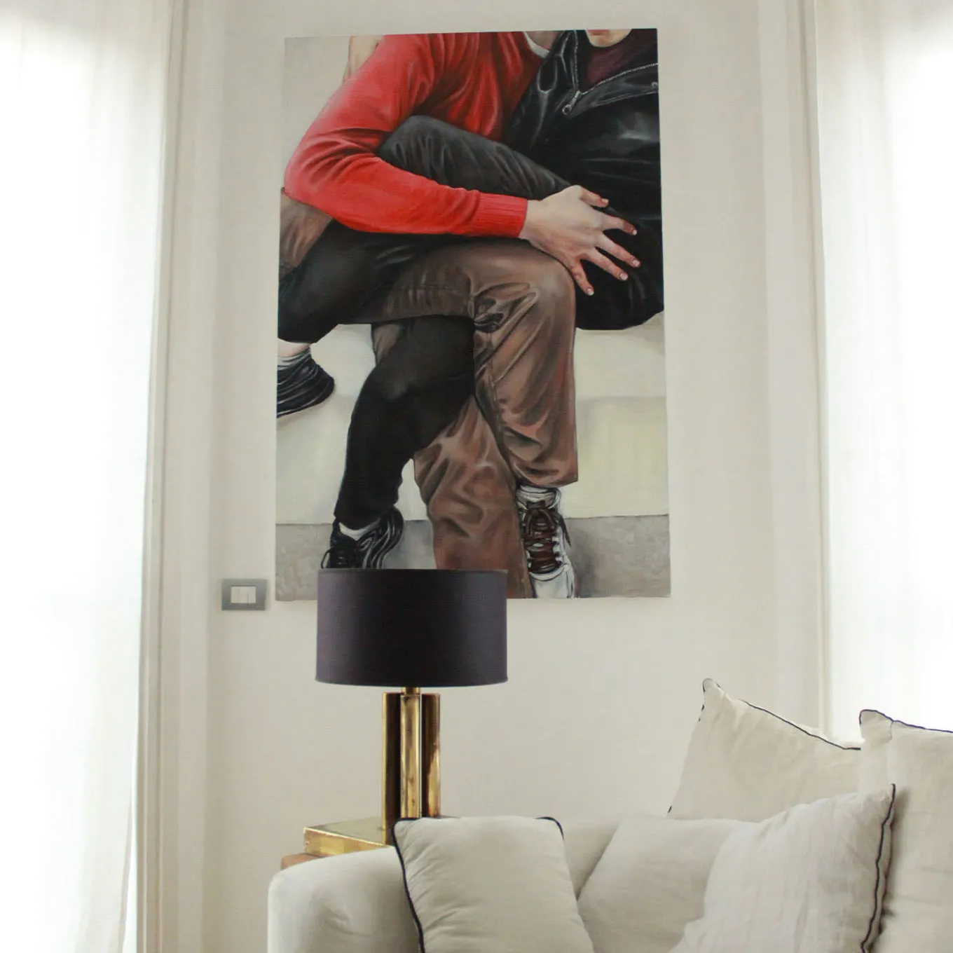 Part of the Candid series of artworks portraying close-ups of daily life with its struggles and affections, this “Untitled Painting” draws inspiration from the harsh reality that people in Ukraine have been forced to experience. Portraying solidarity and strength, closeness, it is made with oil on canvas, supported by a back wooden frame.