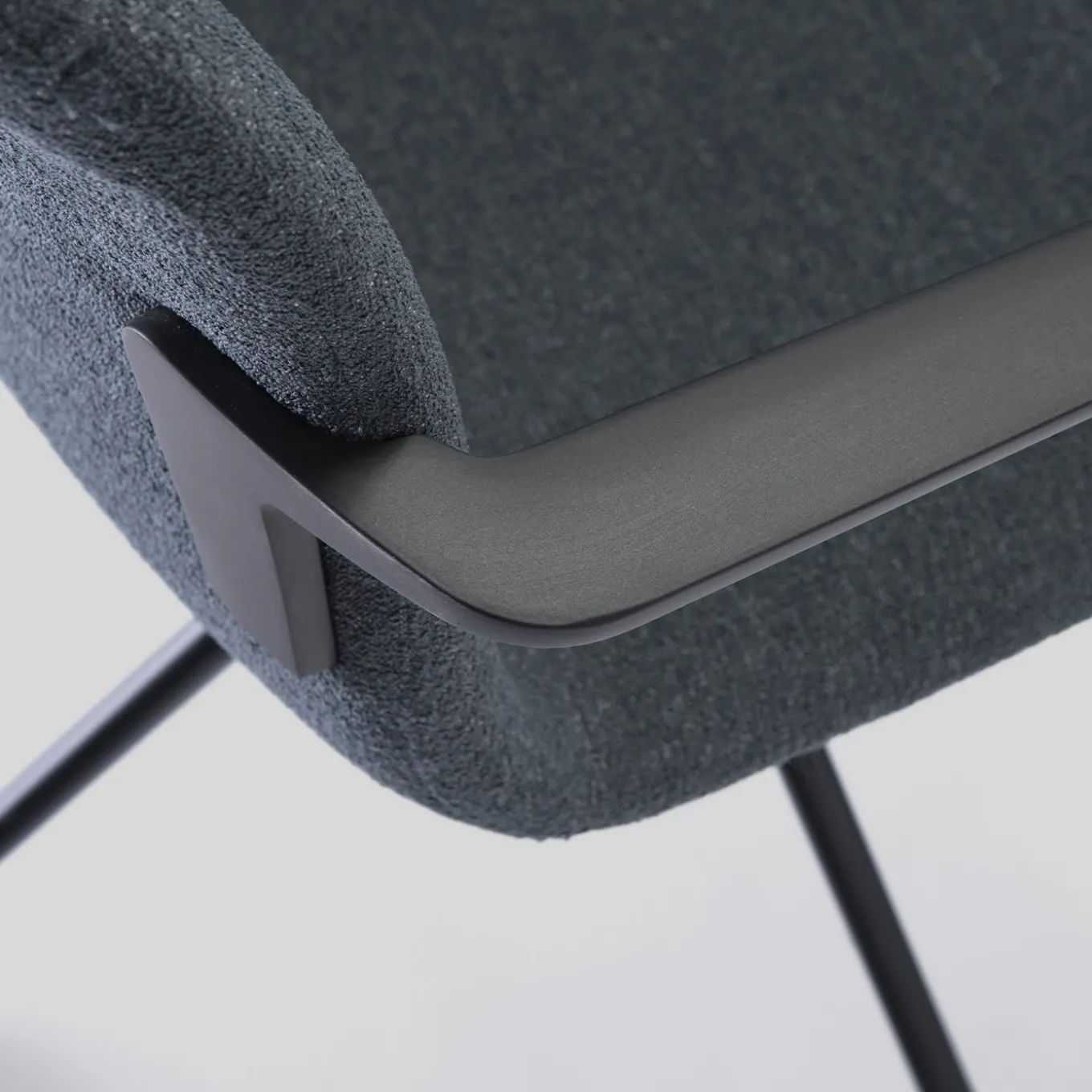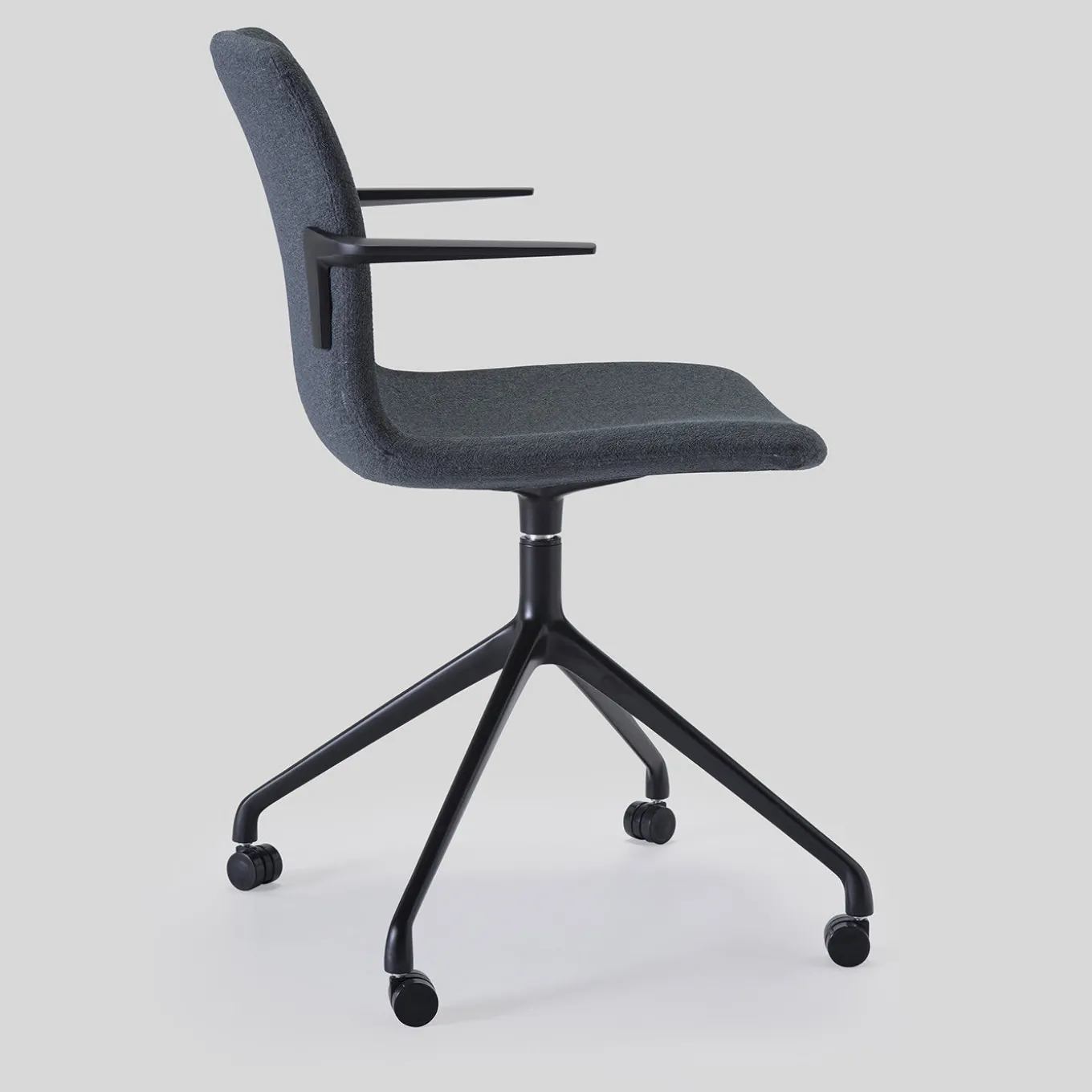 A stunning combination of minimalist aesthetic and ergonomic functionality, this swivel chair will exquisitely complement any home study or office decor. Showcasing an elegant and clean aesthetic, it rests on a matte black-finished metal swivel base with four-spike legs with wheels and features a curved plywood structure upholstered with a dark gray fabric. Customizable in fabric, leather, or eco-leather upholstery, please ask the Concierge for details.
