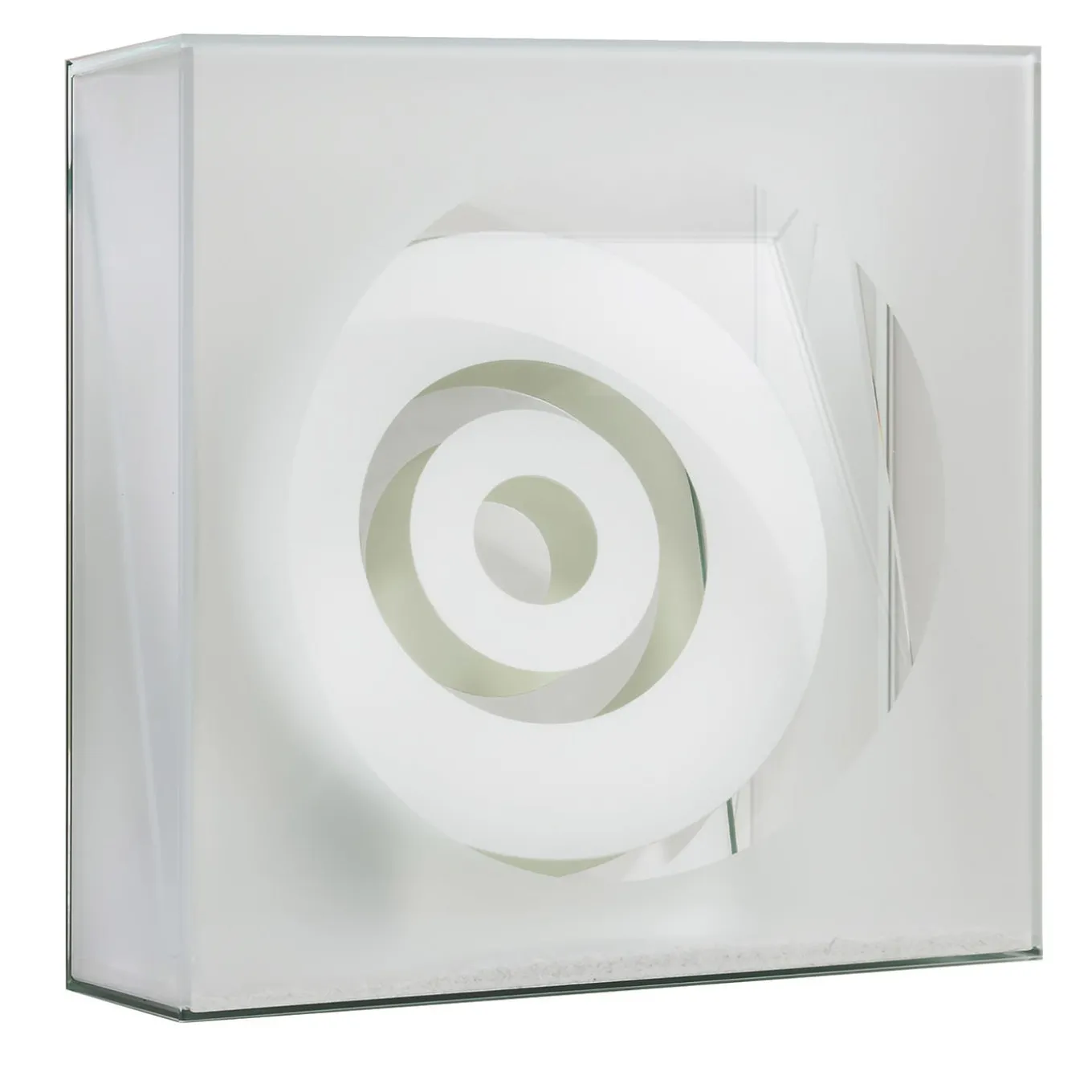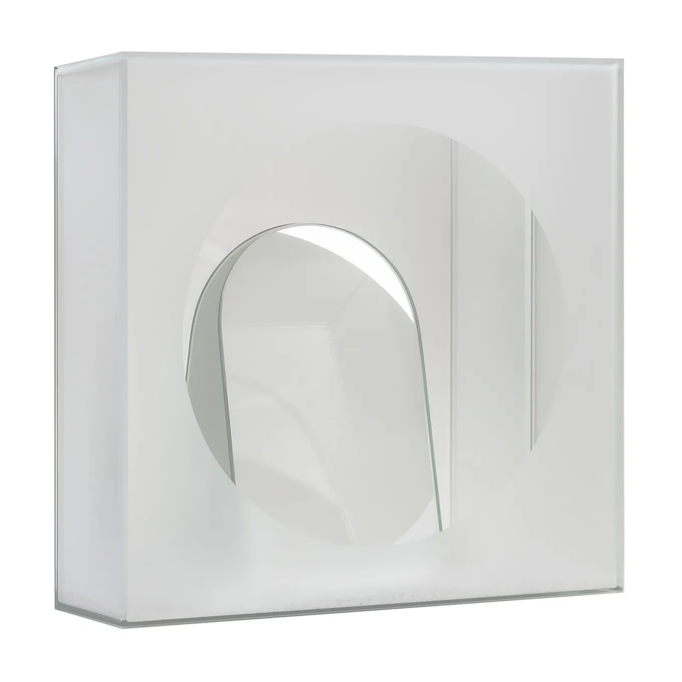 A three-dimensional illustration that takes on volume and shape through areas in light and others in shadow. The deconstruction of reflections on several levels is defined thanks to the calibrated alternation of transparent, reflective, satin or lacquered areas, all placed on a colored sand background that recalls the origins of glass.
