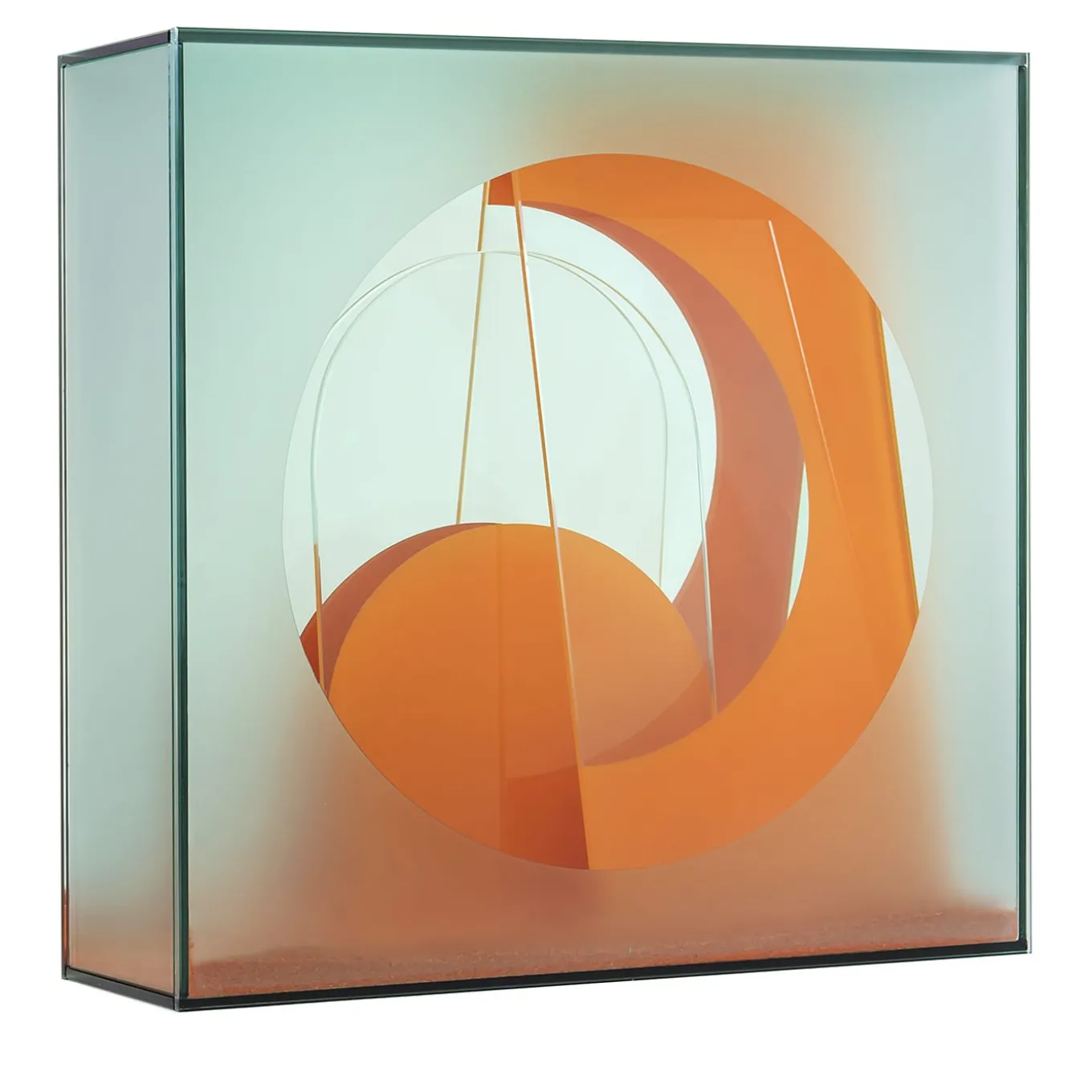 A three-dimensional illustration that takes on volume and shape through areas in light and others in shadow. The deconstruction of reflections on several levels is defined thanks to the calibrated alternation of transparent, reflective, satin or lacquered areas, all placed on a coloured sand background that recalls the origins of glass.