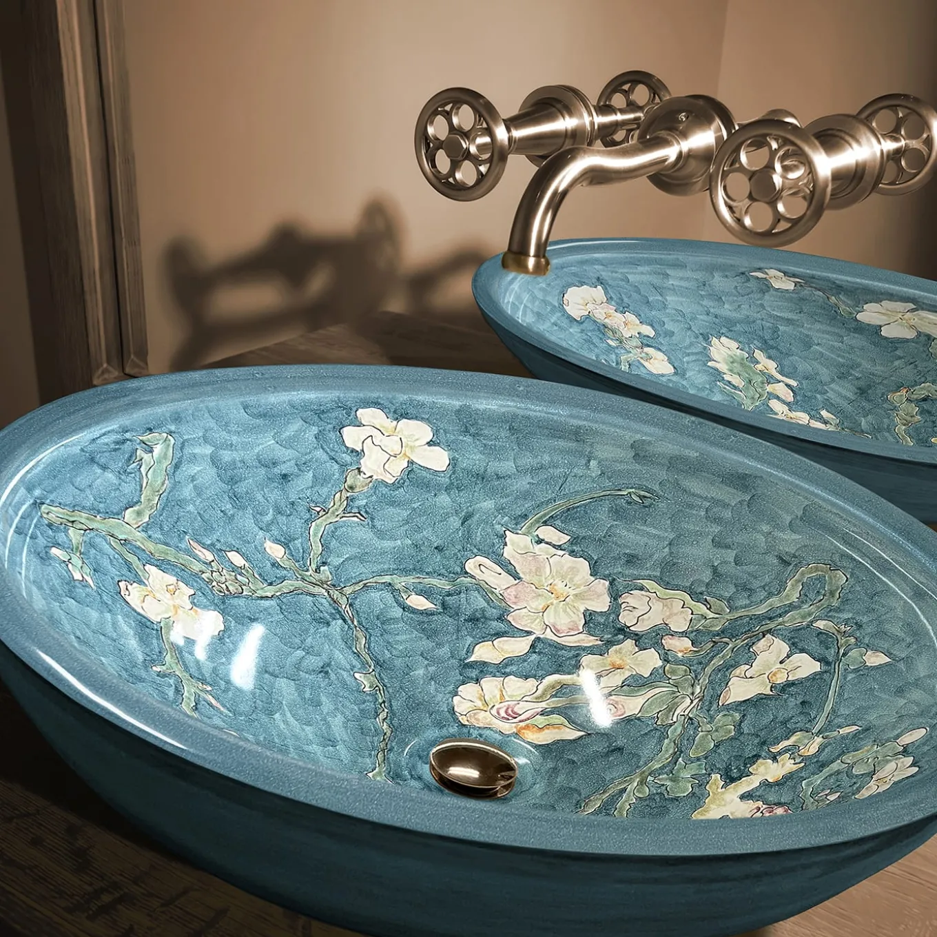 An ode to pottery craftsmanship, this round ceramic sink belongs to the refined series of designs part of the romantic Van Gogh© Francesco De Maio x Van Gogh Museum Collection. Vibrant hues and minute shades here recreate the flowery twigs Vincent van Gogh painstakingly painted in his “Almond Blossom” masterpiece. Offering an extraordinary tactile and visual appeal, each piece is entirely unique.