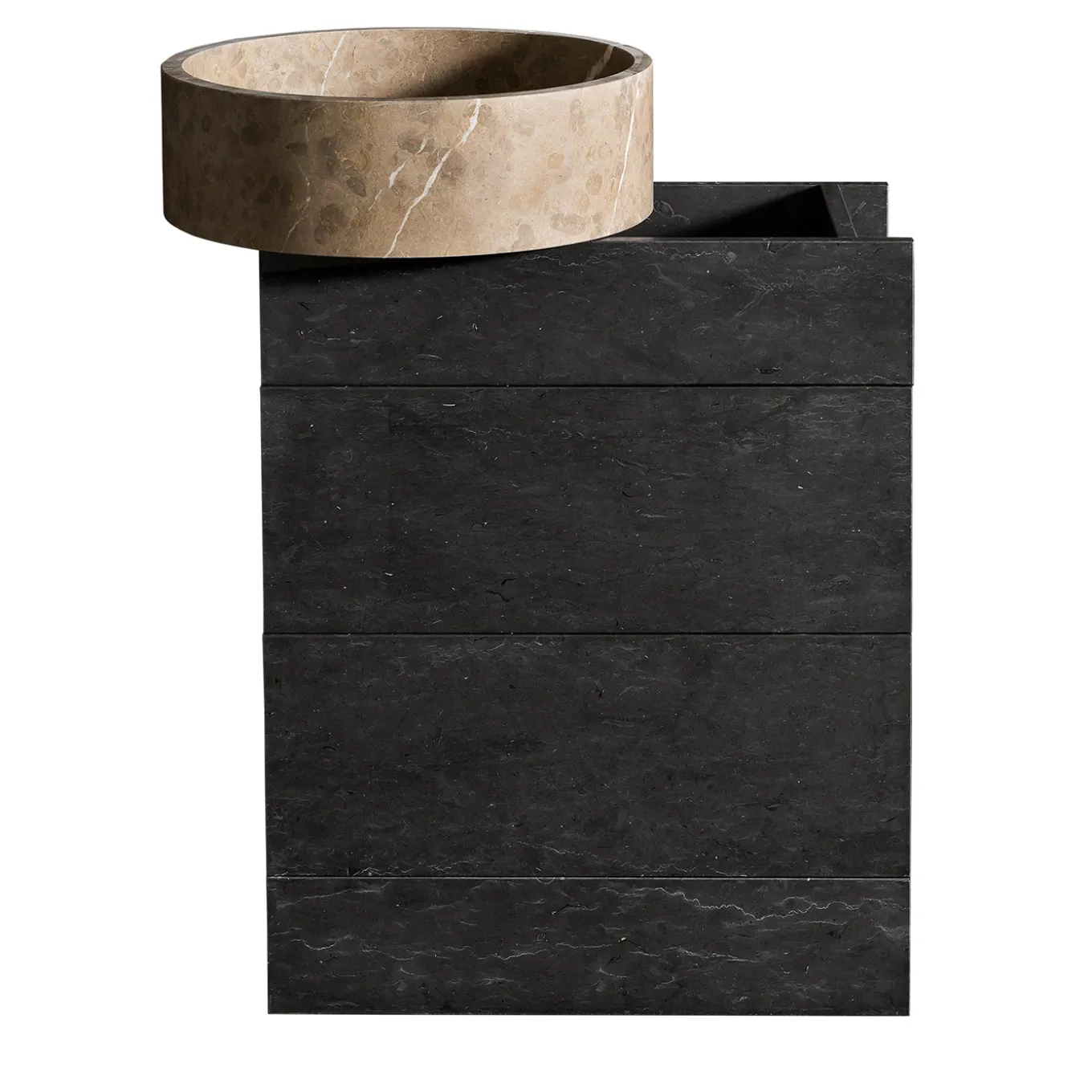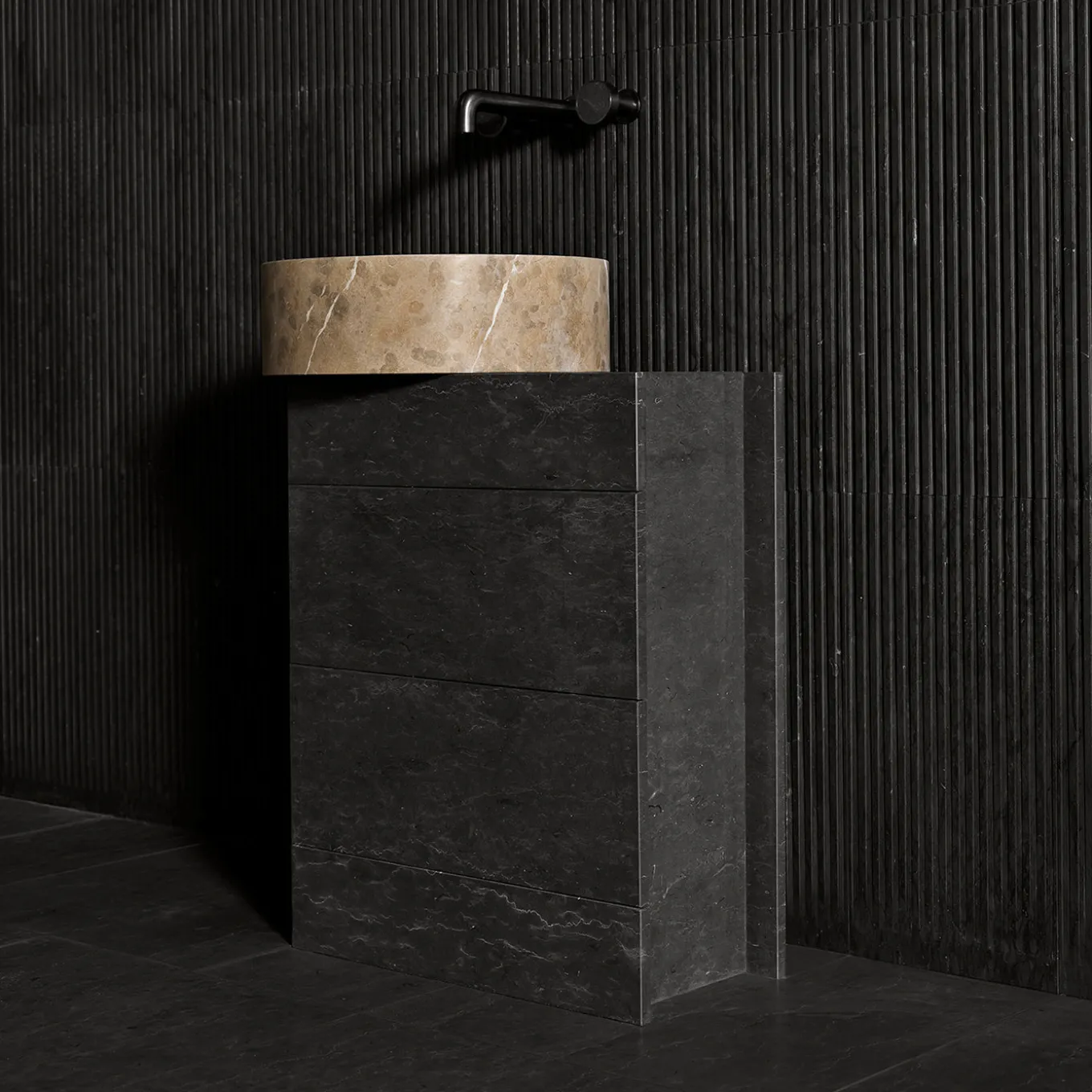 The Vanity 60 features a monolithic design that blends ample storage with space-saving efficiency, making it ideal for compact bathrooms. Paired with the asymmetrical Passage marble washbasin, it creates a distinctive visual impact. The cabinet interior includes compartments crafted from premium wood for organized storage of essentials. Its intersecting panels form a recessed upper surface, providing easy access and minimizing clutter for a practical yet elegant bathroom solution.