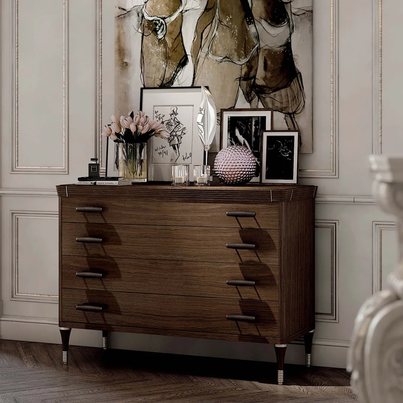 Mid-century inspiration and exceptional craftsmanship are the defining characteristics of this chest of drawers. Crafted entirely of wood, this piece showcases an exquisitely carved top and conical legs with bronzed metal accents that add a contemporary touch. Equipped with four large drawers with cylindrical knobs to store bed linens and refined towels, this wooden dresser makes a dynamic addition to any bedroom.