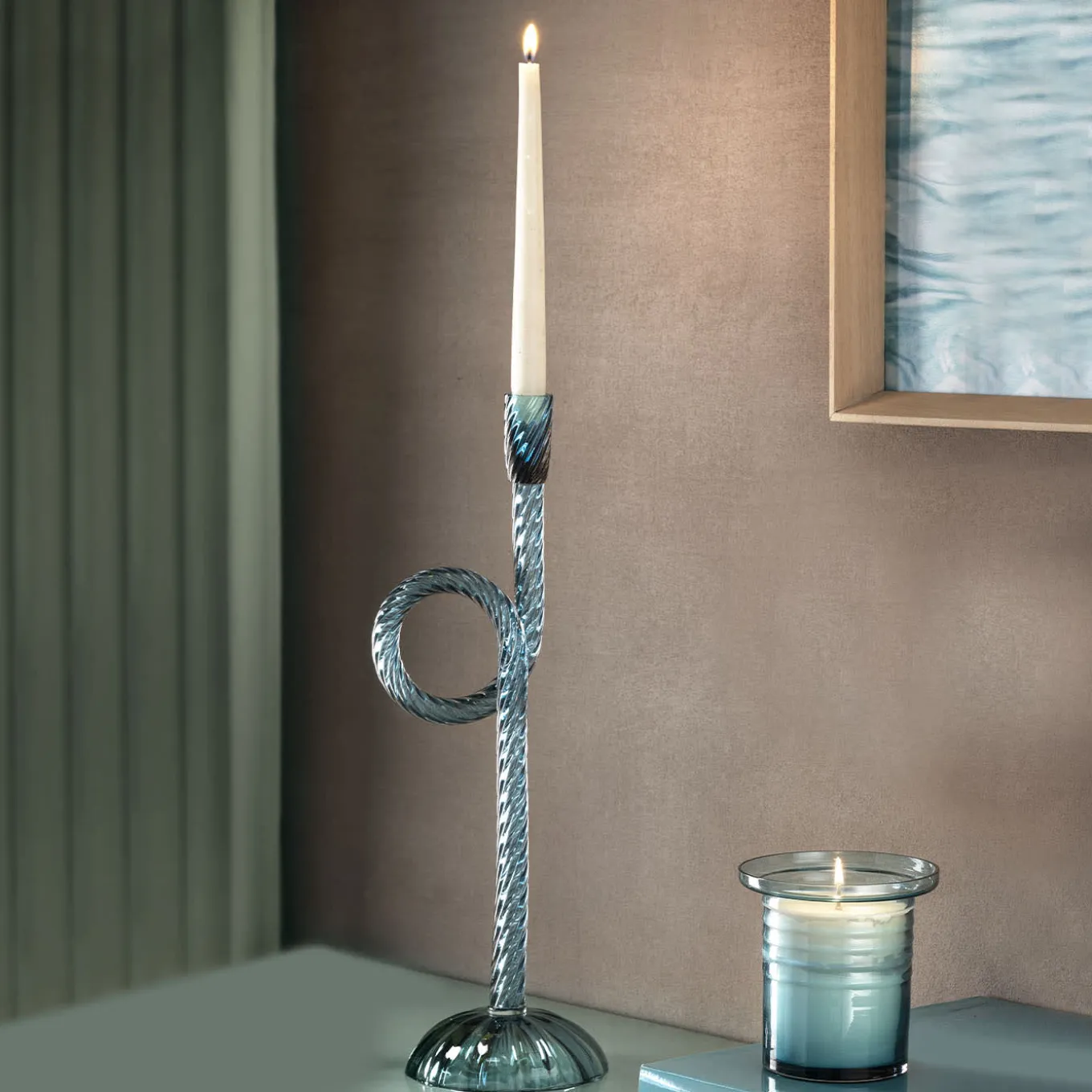 Drawing inspiration from Venetian daily life, the Murano glass knot has a dramatic twisted shape reminding the traditional ropes of the boats. The transparency of the glass is enriched by the rigadin pattern-a source of discrete and mesmerizing glares. This original and contemporary collection of candlestick holders is a physical demonstration of how complex Murano glass blowing and modeling production breath here.