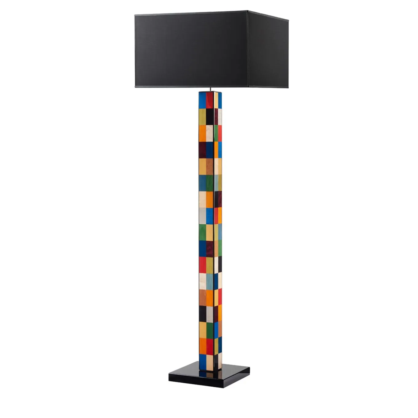 A bold and sculptural objet d’art of contemporary flair, this handcrafted floor lamp features a free-standing silhouette marked by a handmade inlay work boasting colorful rectangles polished and brushed by hand. The piece is completed with a black-lacquered base and a rectangular shade in black fabric. Please consult the Concierge for possible customizations.